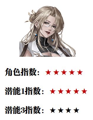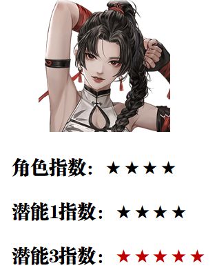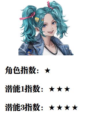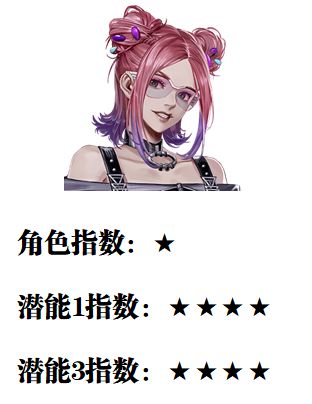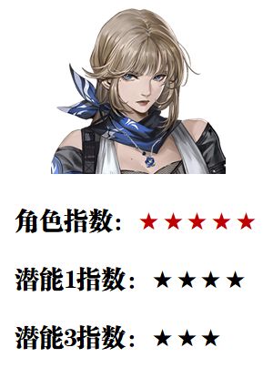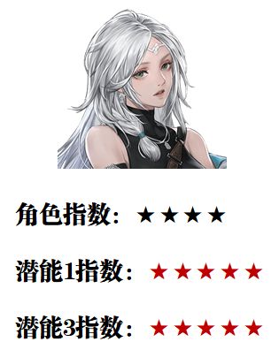 第九位是娜塔莉亚,目前的角色必要性并不是很高,所以维一只给了3颗星,但她个人的潜能1却稍显重要,同样是决定“架起”后能接连做出的输出,最后娜塔的潜能3就......意义不大了。