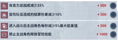 我在冒险队伍中有四个被我选了,先是减少我们输出的一个是攻击总加成减少25%。一是冒险队伍造成的结算减少10%。这两个都是影响我们数值的。后面还有数值更高的,那是为了确保25000点,那么我还是选择最便宜的两个500点。再说一下,这个减少5%最大能量值的。其实我起初非常纠结于这一个,因为毕竟可以减少500点可以选择更多的搭配。但是我发现进入战斗以后,能量完全不够用,很快就被抽干了。所以这个我是保留的。可以利用过宝石来回来发现效果完全跟不上。因为它是每秒5%,但是宝石每秒只有2%,所以跟不上他的回复。另外不管哪个带队的角色都是需要冒险技能的,尤其石化和冰箱,这个是我必选的技能,没有的话非常容易挂掉。所以禁止主战角色释放冒险技能,我是保留了。综合以上的选择来看,其实主要的输出还是在主站。随从只是提供光环buff。没有直接参与战斗的机会,所以对于随从的要求并没有那么高。