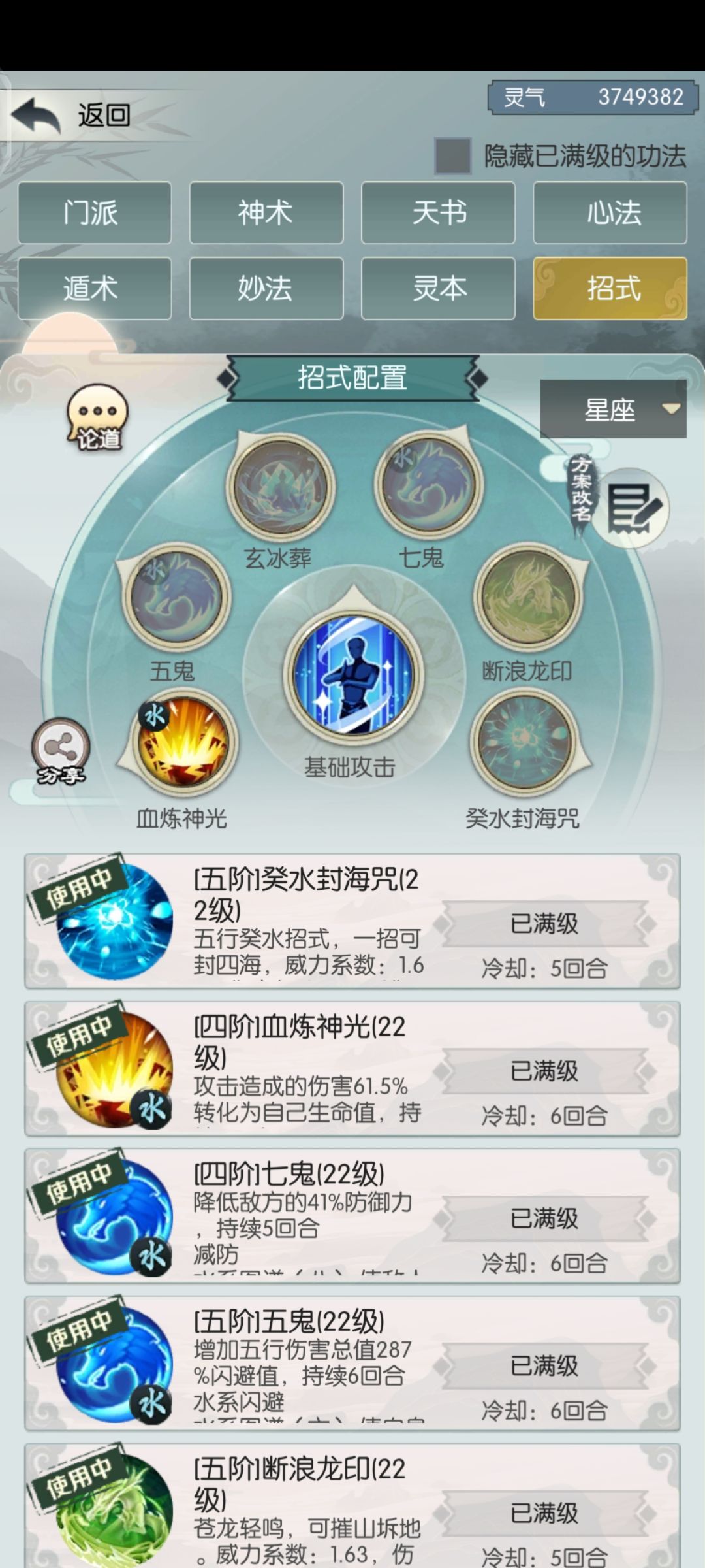 2.人物技能:左至右-血炼神光,五鬼迷踪诀,玄冰葬(水系攻击),七鬼卸甲(配仙灵神垕),断浪龙印(水系攻击) ,癸水封海咒(水系攻击)。