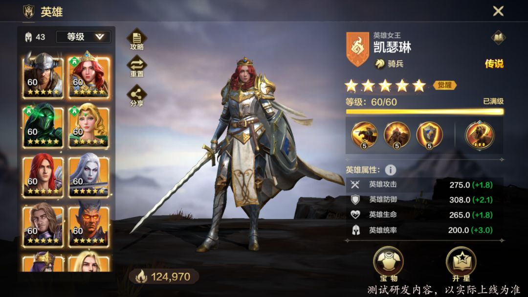 凯瑟琳自身属性极为优秀,同时又拥有连击、焰印记、普攻增伤、免疫缴械、高额击溃回复等机制效果,功能性极强,可以以其为核心构建焰系骑兵队伍,发挥突袭能力强的特点,对敌方后排输出队伍造成大量杀伤。