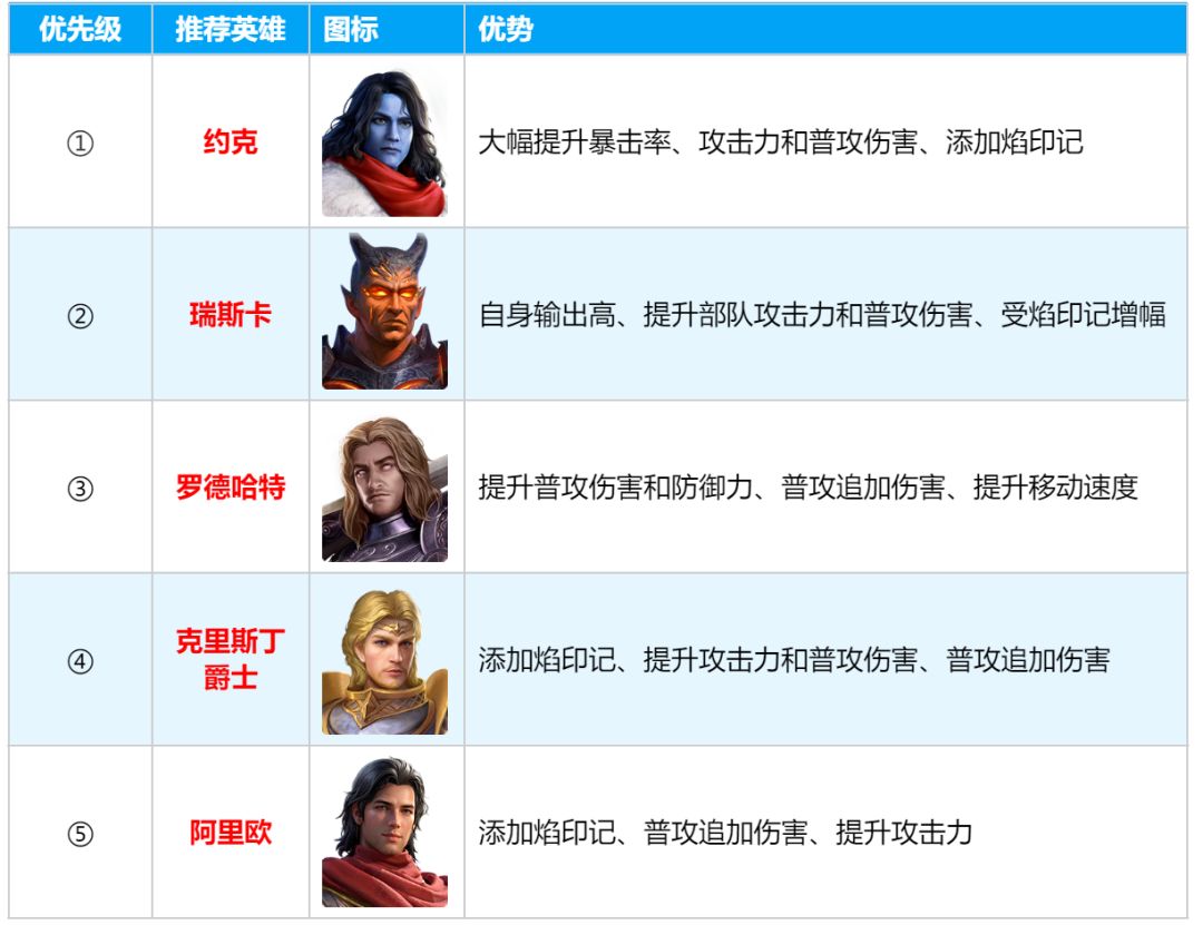 印记机制:凯瑟琳、约克配合光明战士可以获得较高的焰印记层数,进一步提升队伍伤害能力,并强化英雄技能效果。