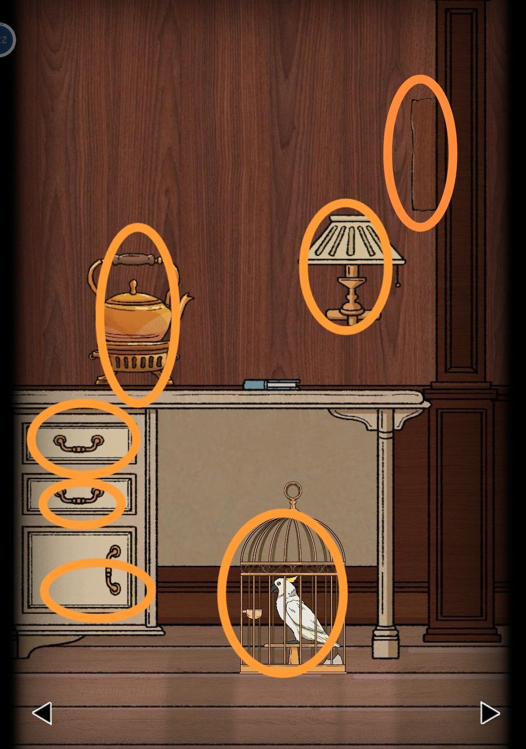 把紫色灯泡安在灯里并打开,把冰块放进炉子里,左侧第一个抽屉里有火柴盒和曲奇,火柴盒放炉子里(转个场景)取出钥匙A,用钥匙C打开第二个抽屉,里面有个钱包在里面是个铜币2,最底下的里面有个旋钮,把曲奇给鹦鹉(转个场景)