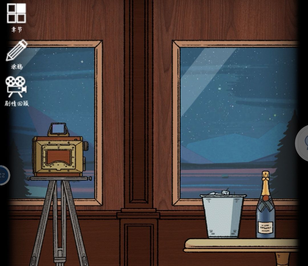 椅子下面有一把餐刀,把冰桶里的酒拿出来,再点冰桶发现冰块里面有把钥匙,拿走冰块。
