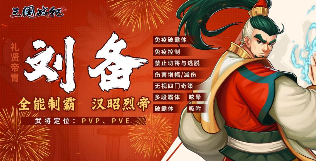 作为蜀国阵营的主公型武将,刘备将会在此次春节活动当天强势首发登场,凭借主动技能和天赋带来的真霸体、破霸体、回血、晕眩、免疫强控、禁止逃脱切将以及被动技能的增减伤和免疫奇策,成为排位竞技赛场上的T0级别武将;同时凭借技能和天赋带来的易伤、提升技攻、暴击、降防等增益Buff,助力主公提升副本输出能力。