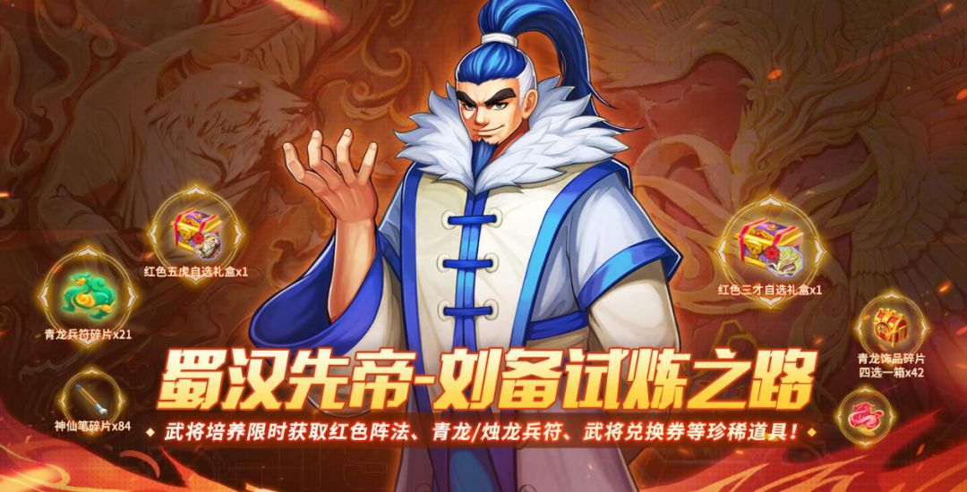 2月9日~2月29日活动期间,刘备武将试炼活动正式开启!使用对应星级刘备完成限时任务可获取“刘备动态头像、刘备动态头像框、红色三才自选礼盒、大量街机币”等道具。完成指定任务同时可获取街机币,可在商店中兑换“红色五虎自选礼盒、烛龙兵符碎片、烛龙香包碎片、无双赵云/无双张飞/无双关羽/法正兑换券”等珍稀资源。特别是红三才和红五虎自选礼盒,可以对原有阵法进行完美的补充升级,特别是原本只有4块或者7块碎片的,更是可以得到五套装或者八套装的提升效果。