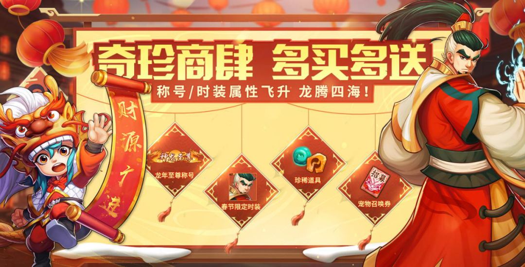 2月9日~2月16日活动期间,限时出售“庆典礼包”打开可获得“龙年春节幸运福袋、S任选升星卡、战魂精华、武圣青龙兵符碎片”等道具,购买达到指定次数可获得“神龙至尊称号(全队普攻+5%,全队技攻+5.5%)、刘备春节时装(技攻+1.5%,生命+1%)、无双郭嘉春节时装(技攻+1.5%,技能2伤害+1%)、宠物召唤券”等稀有道具奖励。