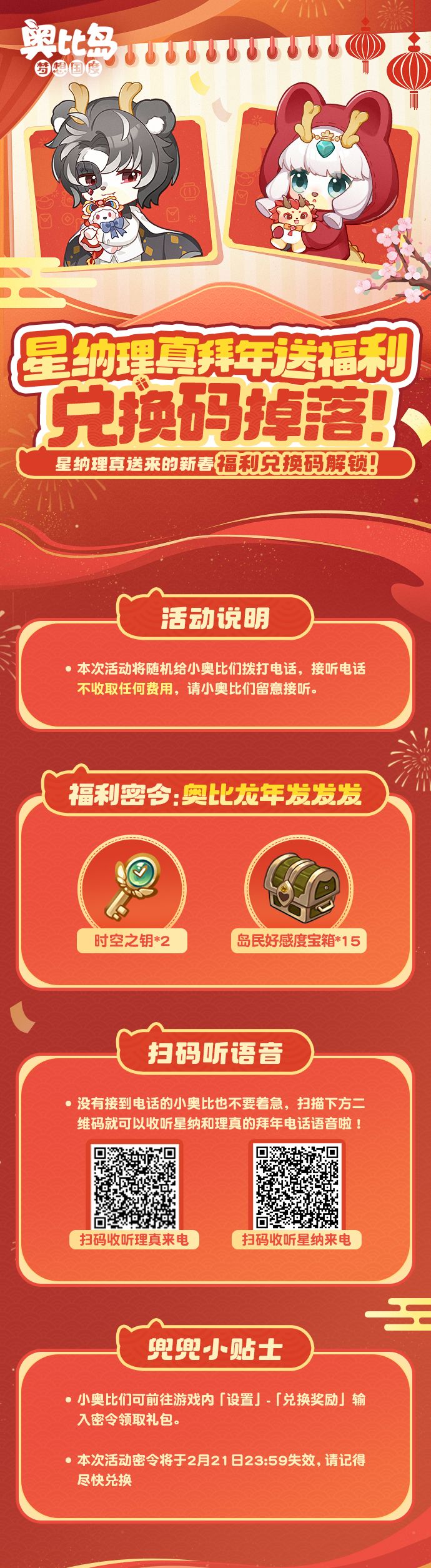 星纳和理真给大家带来新年福利密令:【奥比龙年发发发】。小奥比们可前往游戏内「设置」-「兑换奖励」输入密令,即可领取【时空之钥*2、岛民好感度自选箱*15】,密令将于2月21日23:59失效,请记得尽快兑换噢~详细奖励可戳下图查看👇