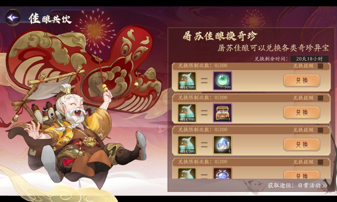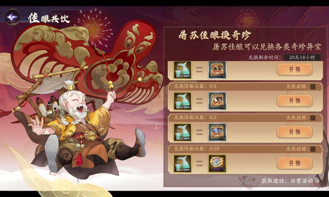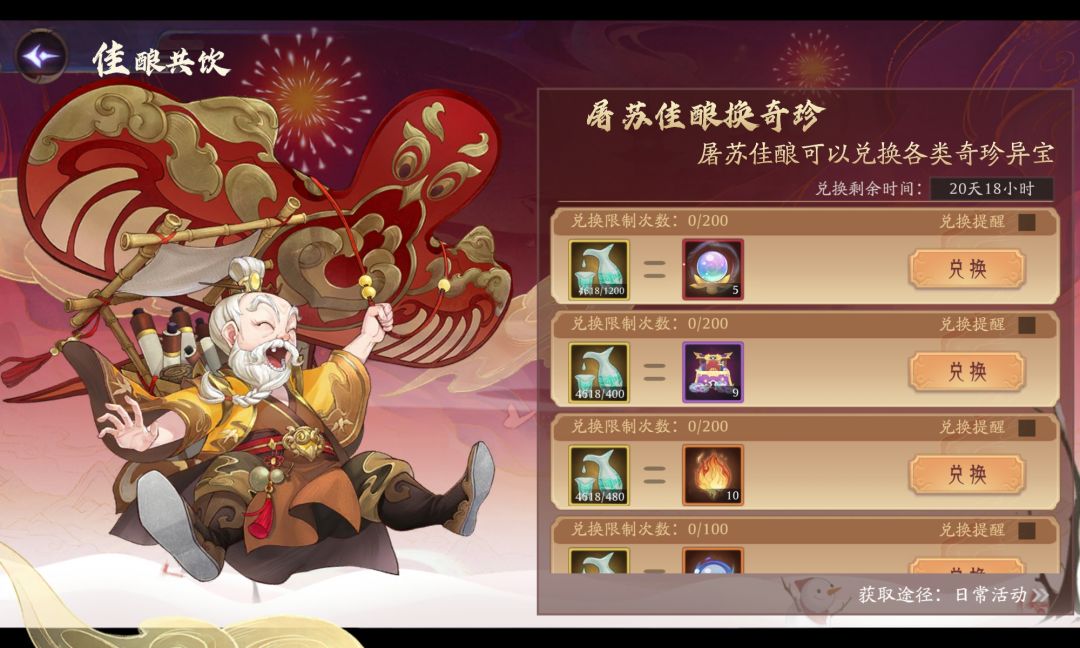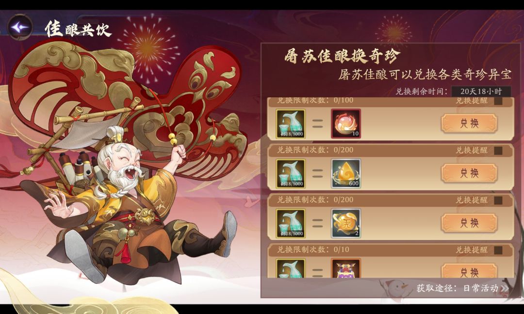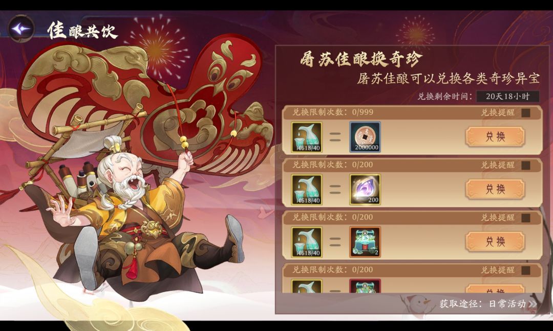 抛开比较任性的玩法,个人建议可以按照以下步骤来考虑兑换类别和兑换数量1.妖魄够用吗?不够用先把妖魄换完吧!40*200=8000屠苏酒先干了!