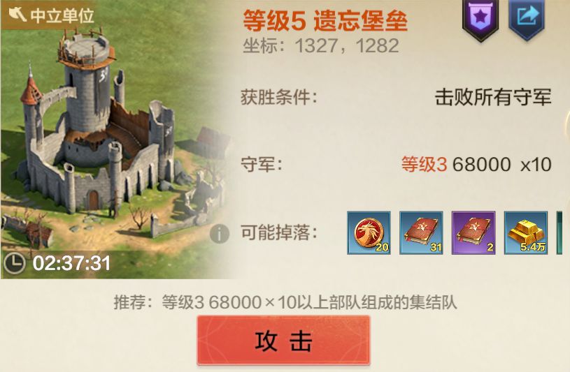 参与方式:通过搜索功能发现遗忘堡垒位置,点击发起集结,等待盟友部队加入集结后,即可行军前往发起攻击。挑战消耗:每次挑战需要消耗200行动力,不限制挑战次数,挑战失败不消耗行动力。