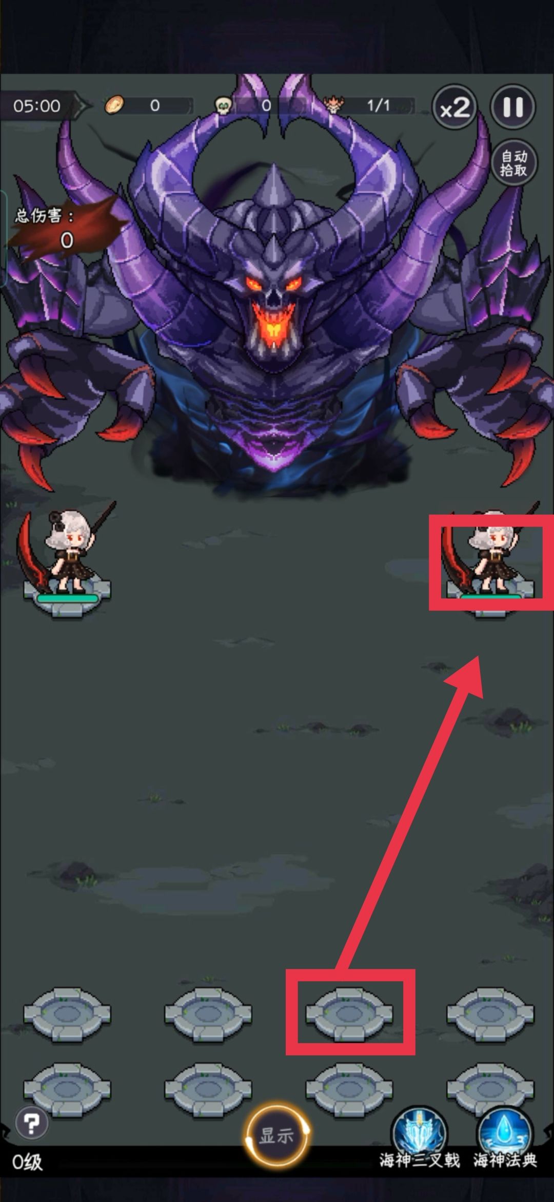 重点来了。以一个s恶魔为例,每次魔王抬手出现护盾的时候,就把前排的花和s恶魔调换位置,有一点儿延迟后小怪出现,一直点中心的怪,小怪解决之后,魔王护盾快消失时,再换回原来的位置。实测比不换位置聚怪速度更快,推测可能的原因是魔王的残留黑洞。放下面可能新的黑洞距离残留黑洞远,相互拉扯,每一波浪费3到5s的时间;而放上面新的黑洞距离残留黑洞近,不会相互拉扯,从而比原来的聚怪速度快。三个s恶魔,就换第二排的那个s恶魔,操作一样。示意图如下:
