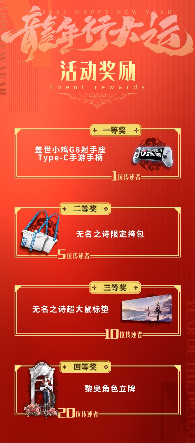 我们将在符合活动条件的传述者中,随机抽取1位送出【盖世小鸡G8射手座Type-C手游手柄】1台,5位送出【无名之诗限定挎包】1个,10位送出【无名之诗超大鼠标垫】1份,20位送出【黎奥角色立牌】1份!