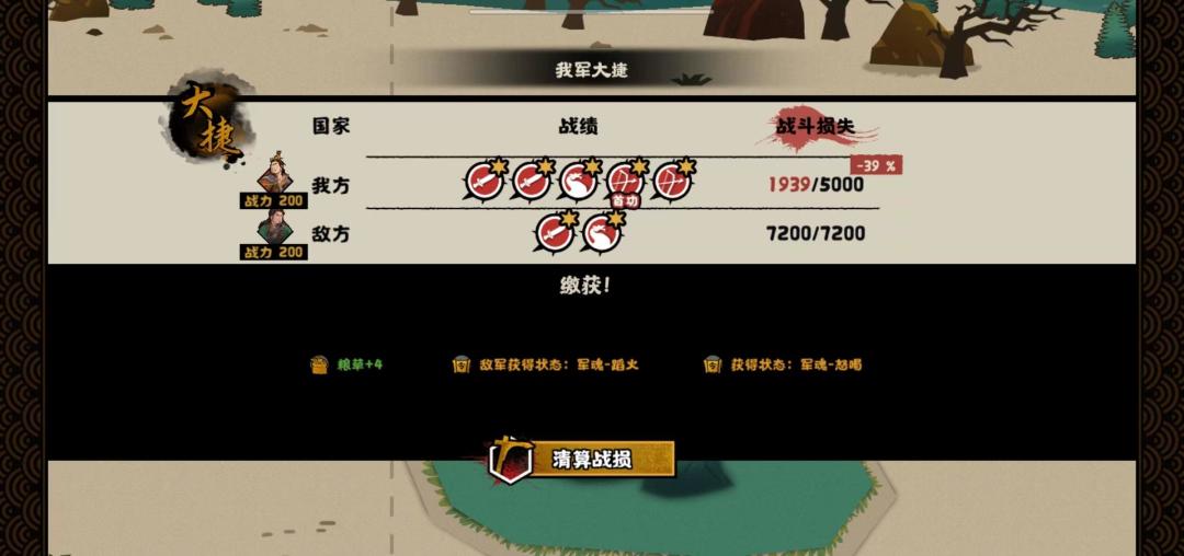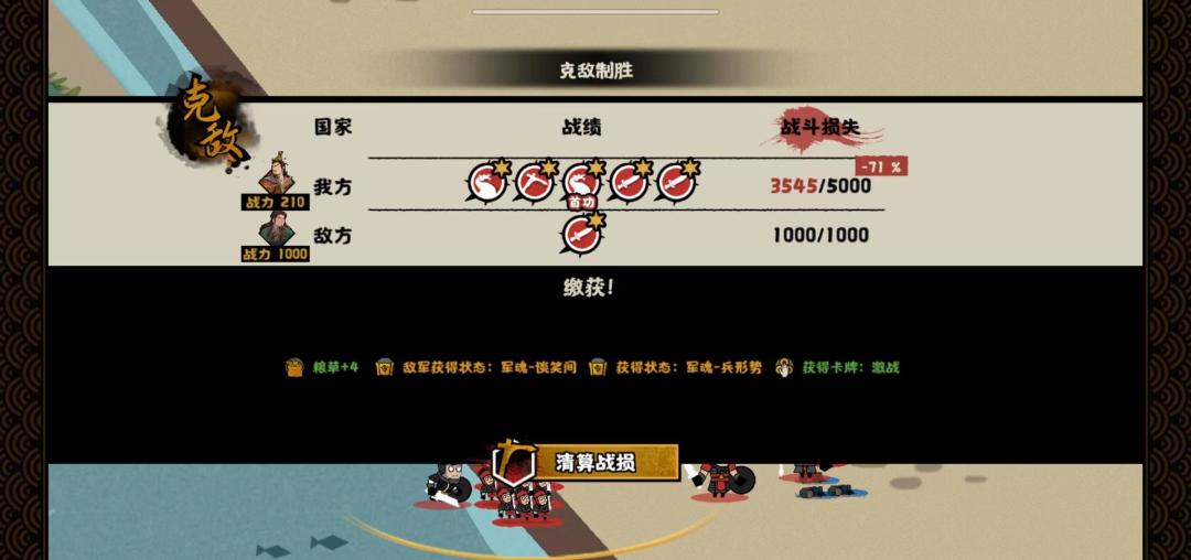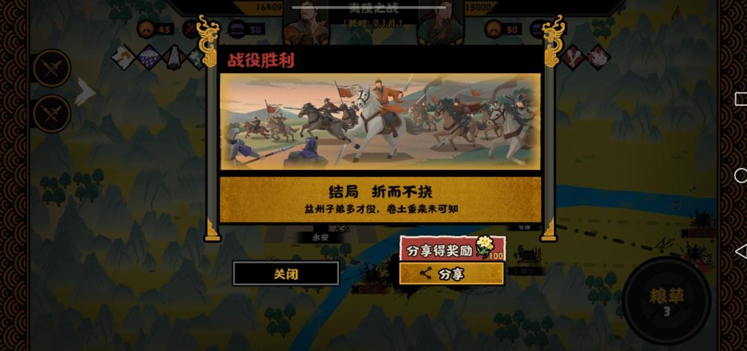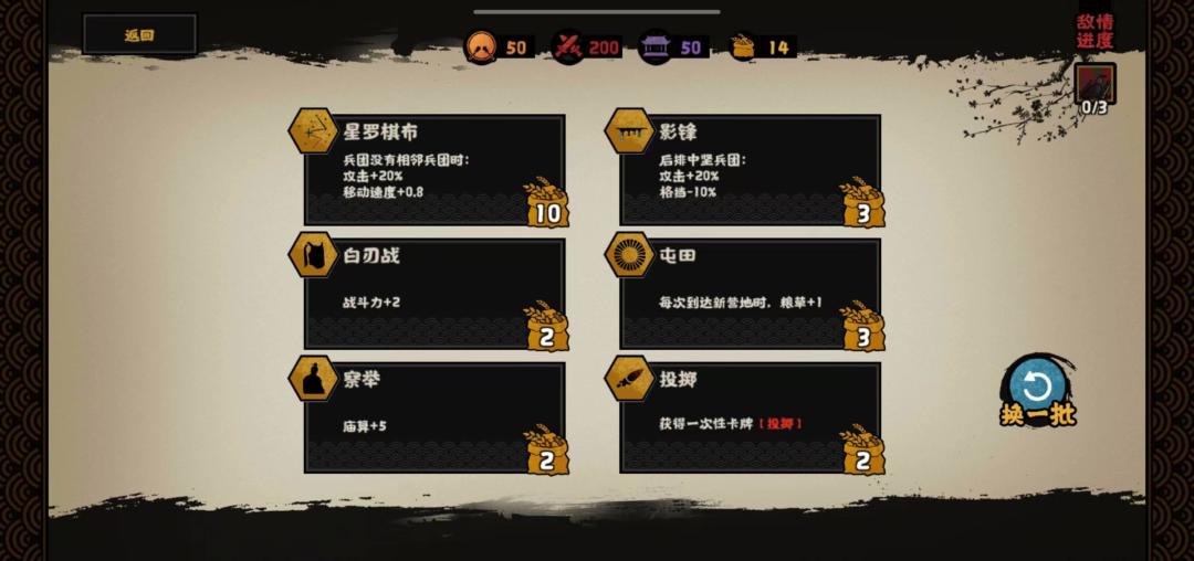 夷道战斗胜利后,依旧选择5粮草,继续购买兵法政策。如果接下来的路上能够遇到对策,也可考虑保留粮草,尝试组合兵法。