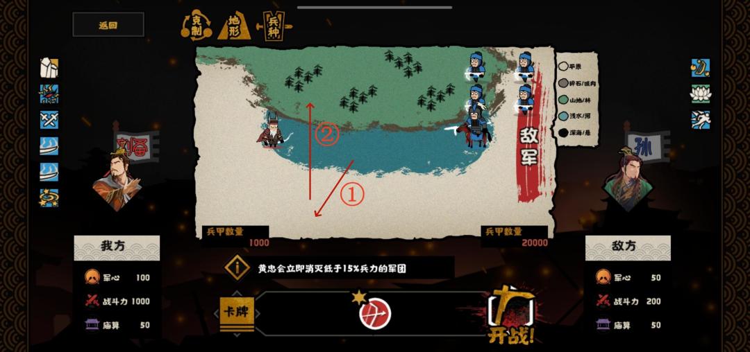 到达夷陵后,触发第四场营地战斗,开局使用第一张移动将黄忠朝我方水域左下方移动,保证勾引对方弓兵与骑兵到水域之中。