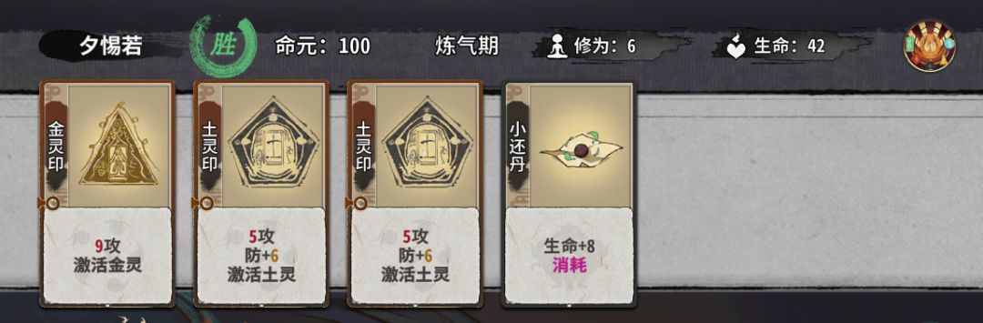 在大混元体系中,燃印的优先度不高,但要是一转思路,当丹木打,燃印又是必选的仙命。所以,我个人认为点不点燃印是非常纠结的。在大部分元婴较顺利,换牌较多,有金、木秘印之一的情况,我会拿修为,去追大混元。