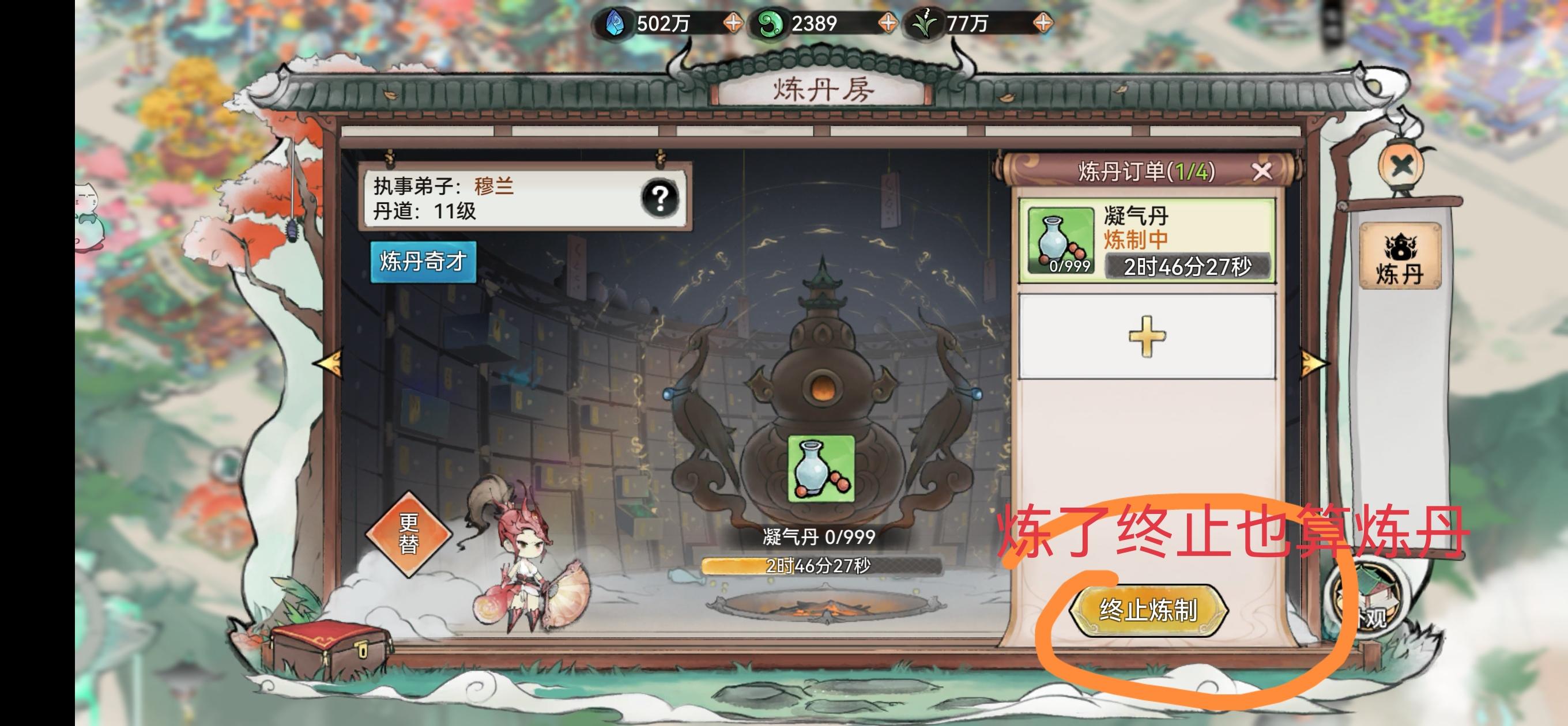 其实这游戏炼制丹药的任务的结算在你点击炼制的那一下,也就是说你炼制999炉,点开始了,他任务就算999炉,这时候我们直接终止炼制就行啦,如图