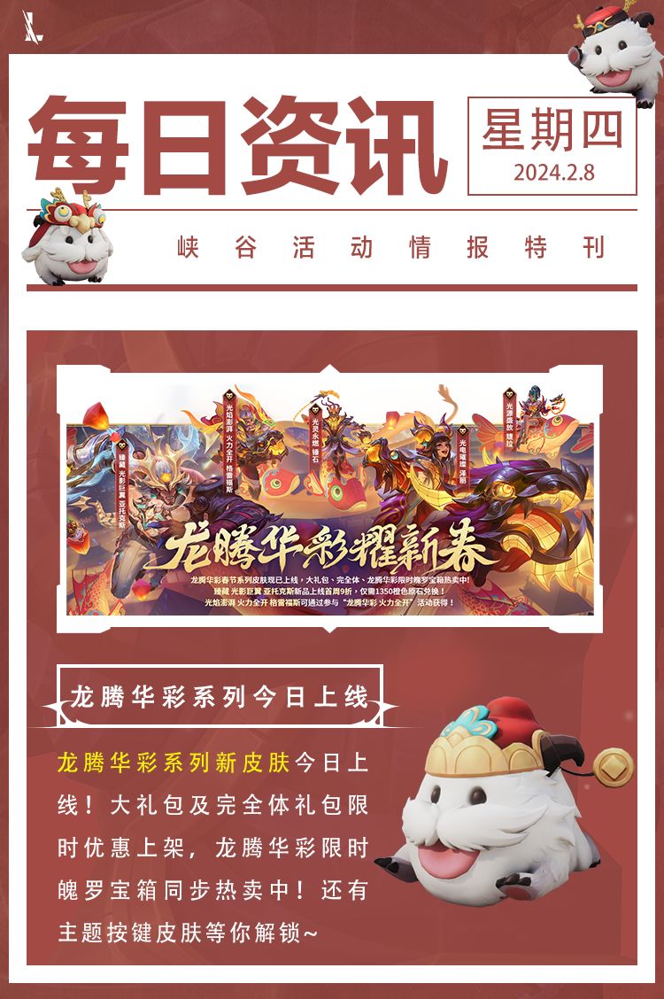 龙腾福跃,华彩迎春!龙腾华彩系列皮肤已于今日上线峡谷。今日起,截止至2月25日23:59,龙腾华彩迎春大礼包、完全体礼包限时上架,还有龙腾华彩限时魄罗宝箱同步惊喜热卖中~