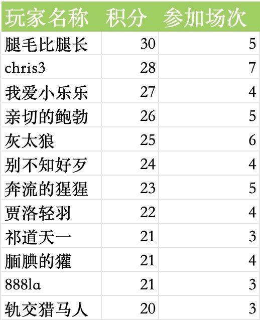 各位玩家好,非常感谢大家的参与和支持。恭喜以下玩家获得额外奖励,他们的积分分别为:【腿毛比腿长】 30分、【chris3】 28分、【我爱小乐乐】 27分、【亲切的鲍勃】 26分、【灰太狼】 25分、【别不知好歹】 24分、【奔流的猩猩】 23分、【贾洛轻羽】 22分、【祁道天一】 21分、【腼腆的獾】 21分、【888la】 21分、【轨交猎马人】 20分,其他参与的玩家获得参与奖励。