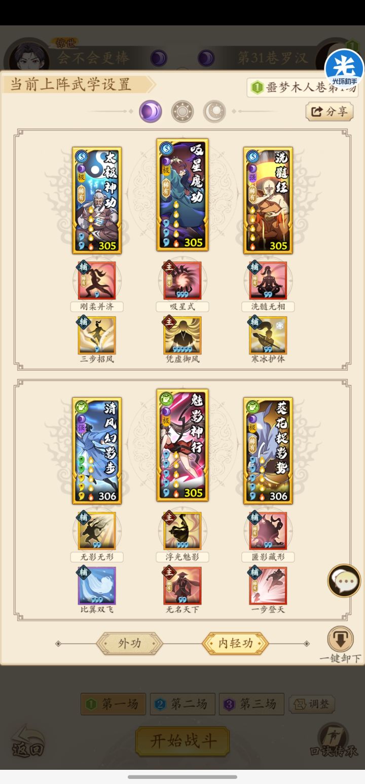 第二套,光明磐石绣春刀。是我今晚顿悟的结果,脑子一瞬间开悟,是我玩无名一来智商大爆发想出来的套路,真的绝了兄弟们,我做高数编程都没这么聪明过。先说这一关为什么是最难的,对面木人多出手多后手,而且主潜龙,不怕麻痹。同时回血高,一次二三十万,非常变态。