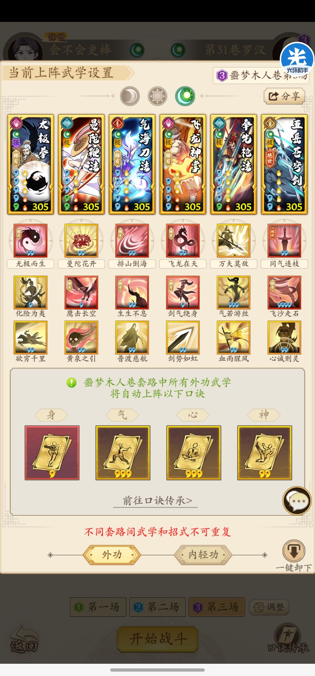 第三套,太极曼陀调和剑。第三关我打了好多次60回合伤害不够打不死。索性直接上太极拳和曼陀鞭法,最后通关有惊无险。