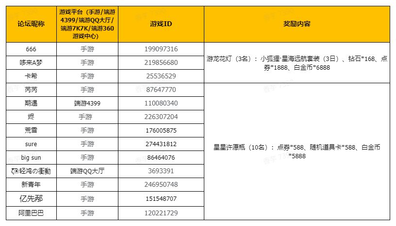 游龙花灯(3名):小狐狸·星海远航套装(3日)、钻石*168、点券*1888、白金币*6888