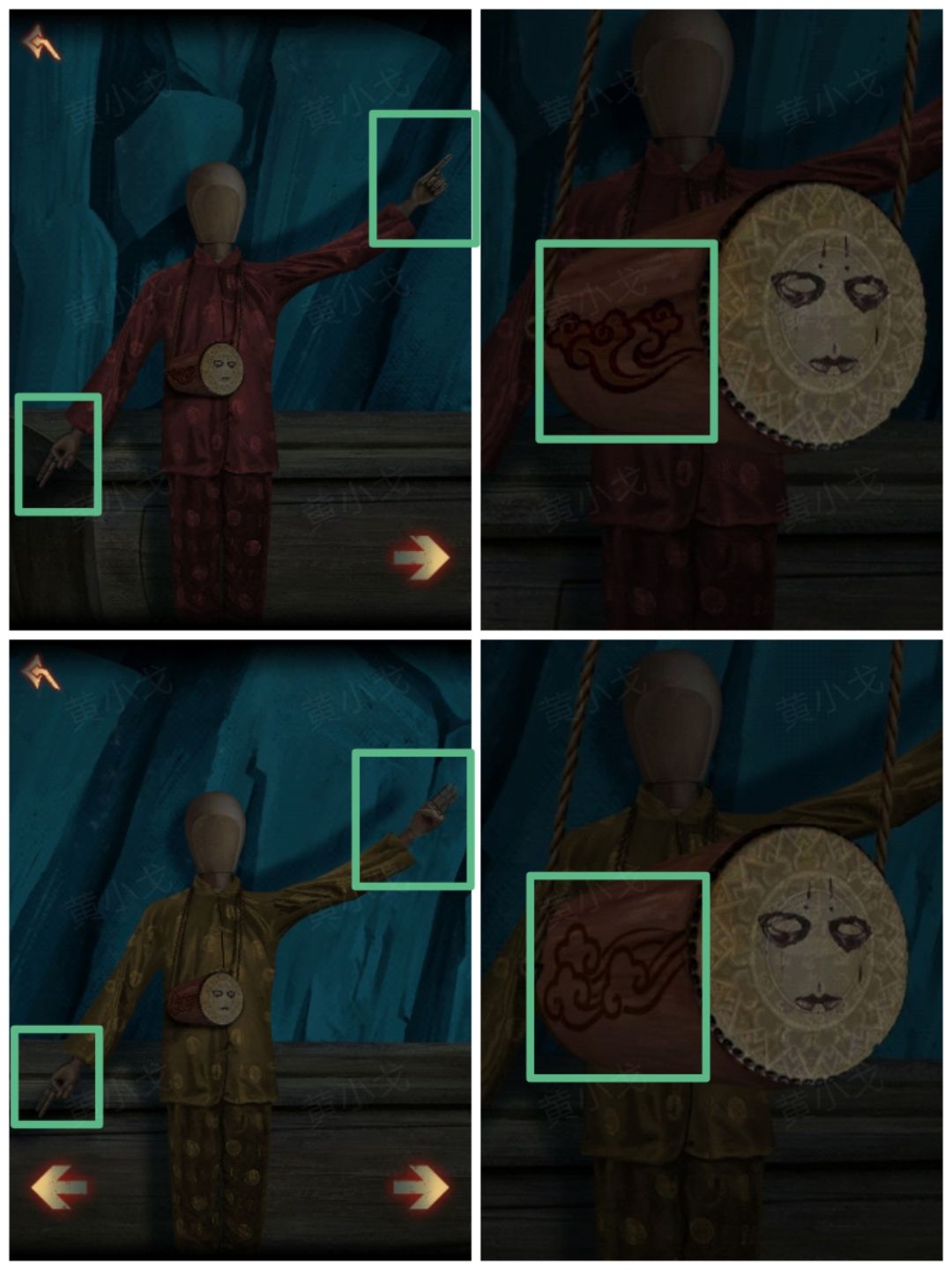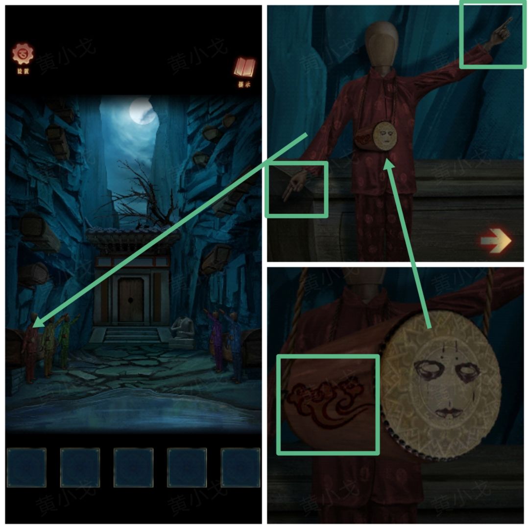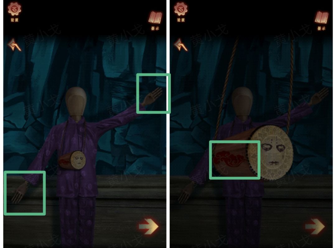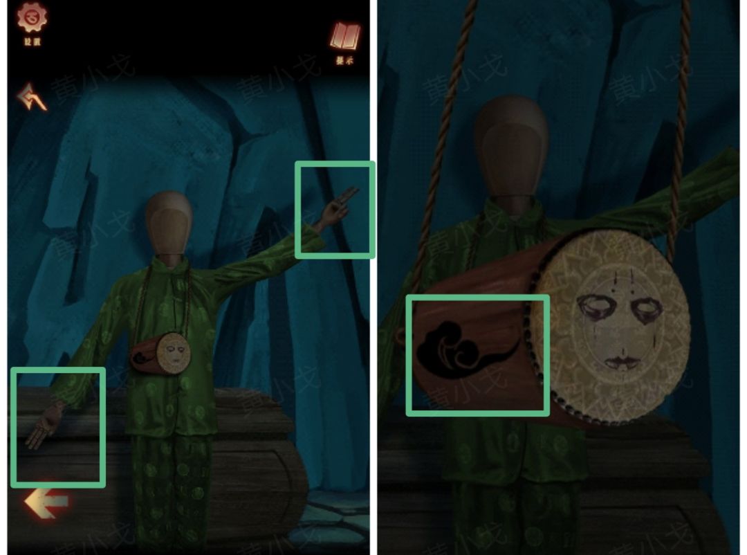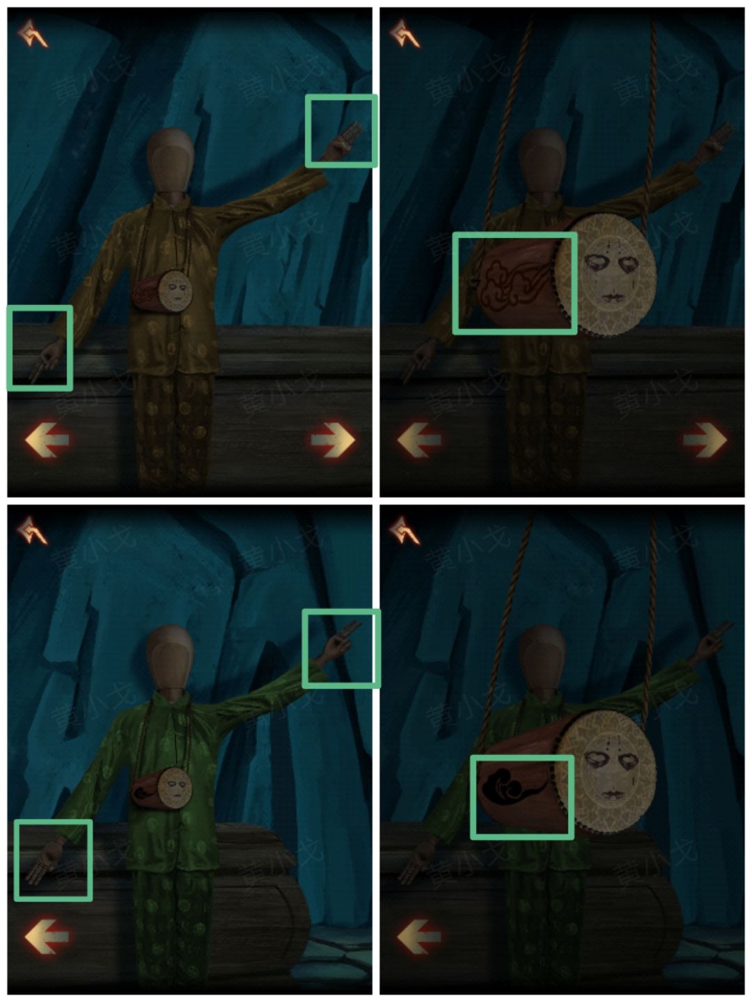 22.(祭坛外)点击查看左边的人偶(注意人偶的衣服颜色和左右手比出的数字及小鼓上的花纹)(红:左-1,右-2、黄:左-3,右-2、绿:左-2,右-3)
