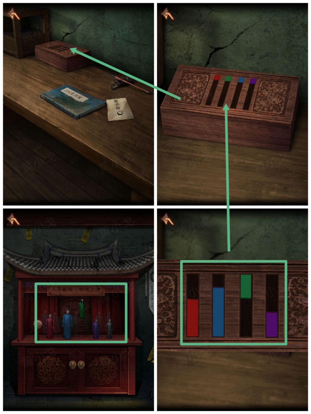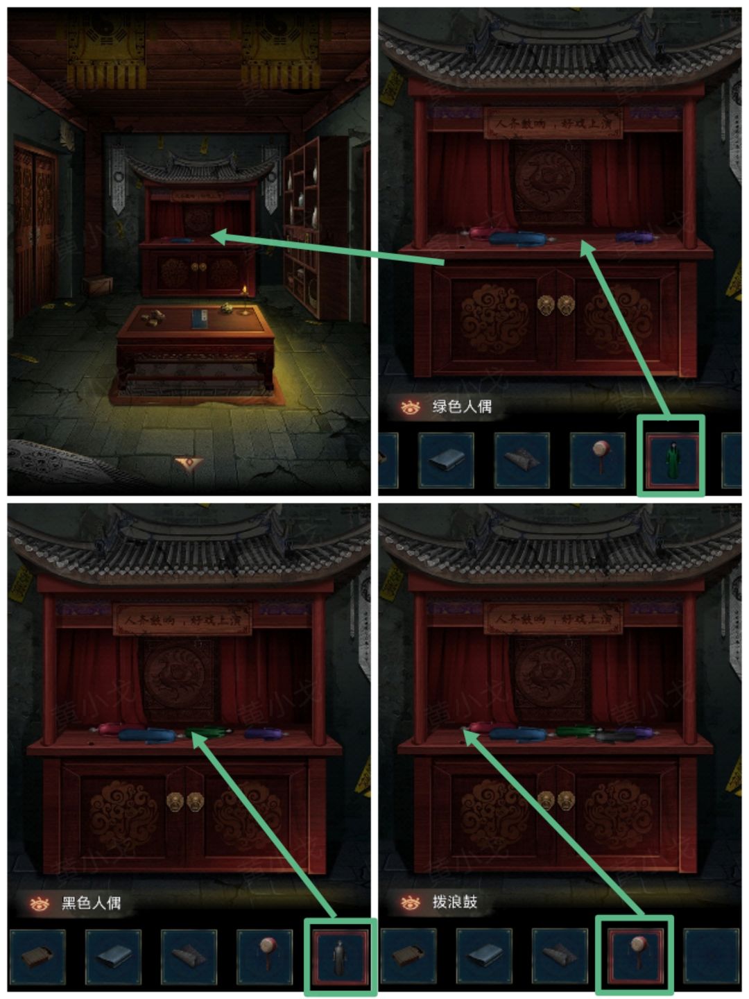 1.(戏台)点击戏台,放上【绿色人偶】、【黑色人偶】和【拨浪鼓】