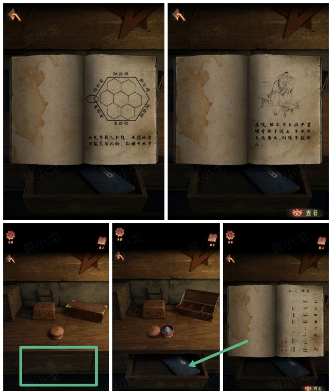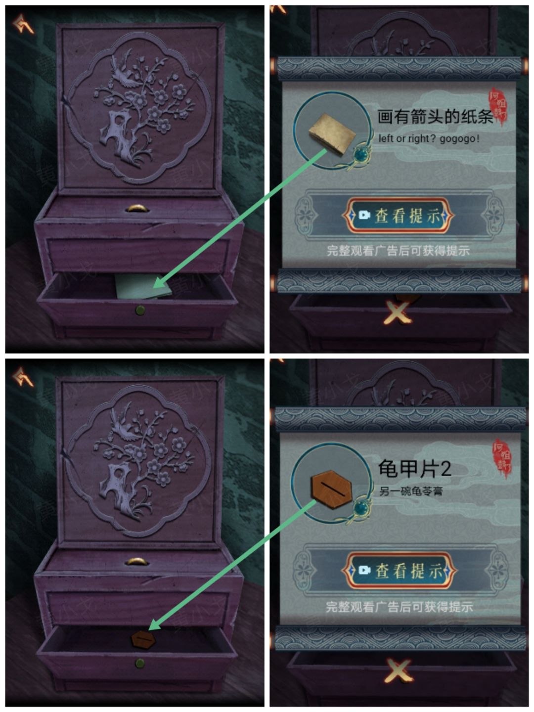 16.打开抽屉,获得【带有箭头的纸条】和【龟甲片2】