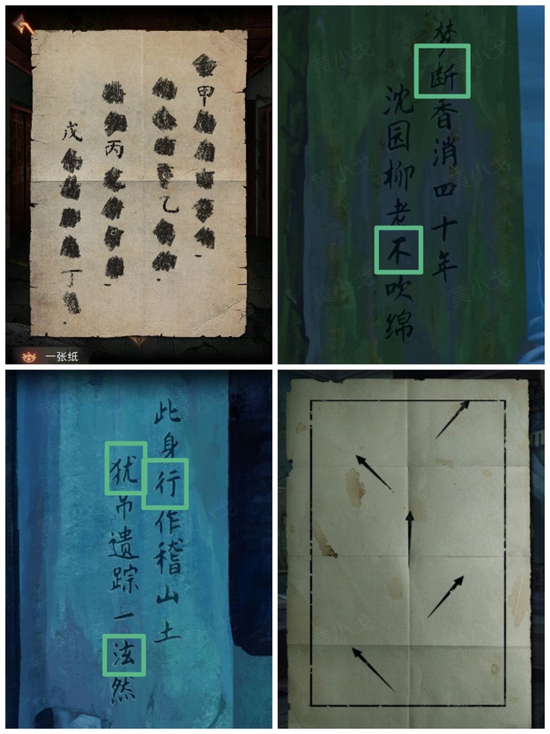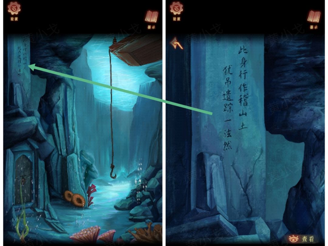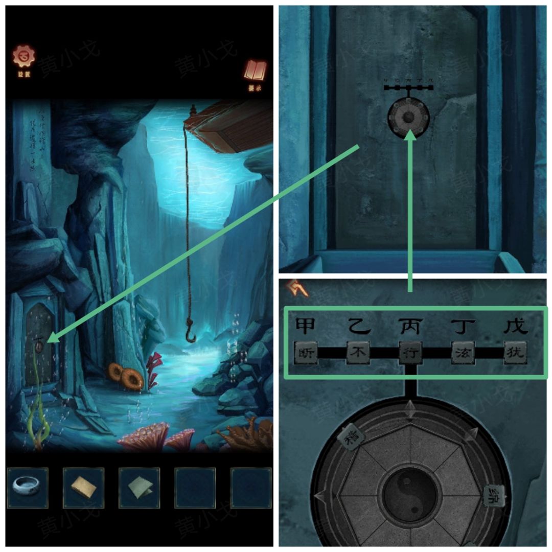 21.点击石门上的机关,根据【带有箭头的纸条】和【一张纸】上的线索,找到两块石碑上对应的字,调整字石块的位置,打开门(甲乙丙丁戊对应断不行泫犹)