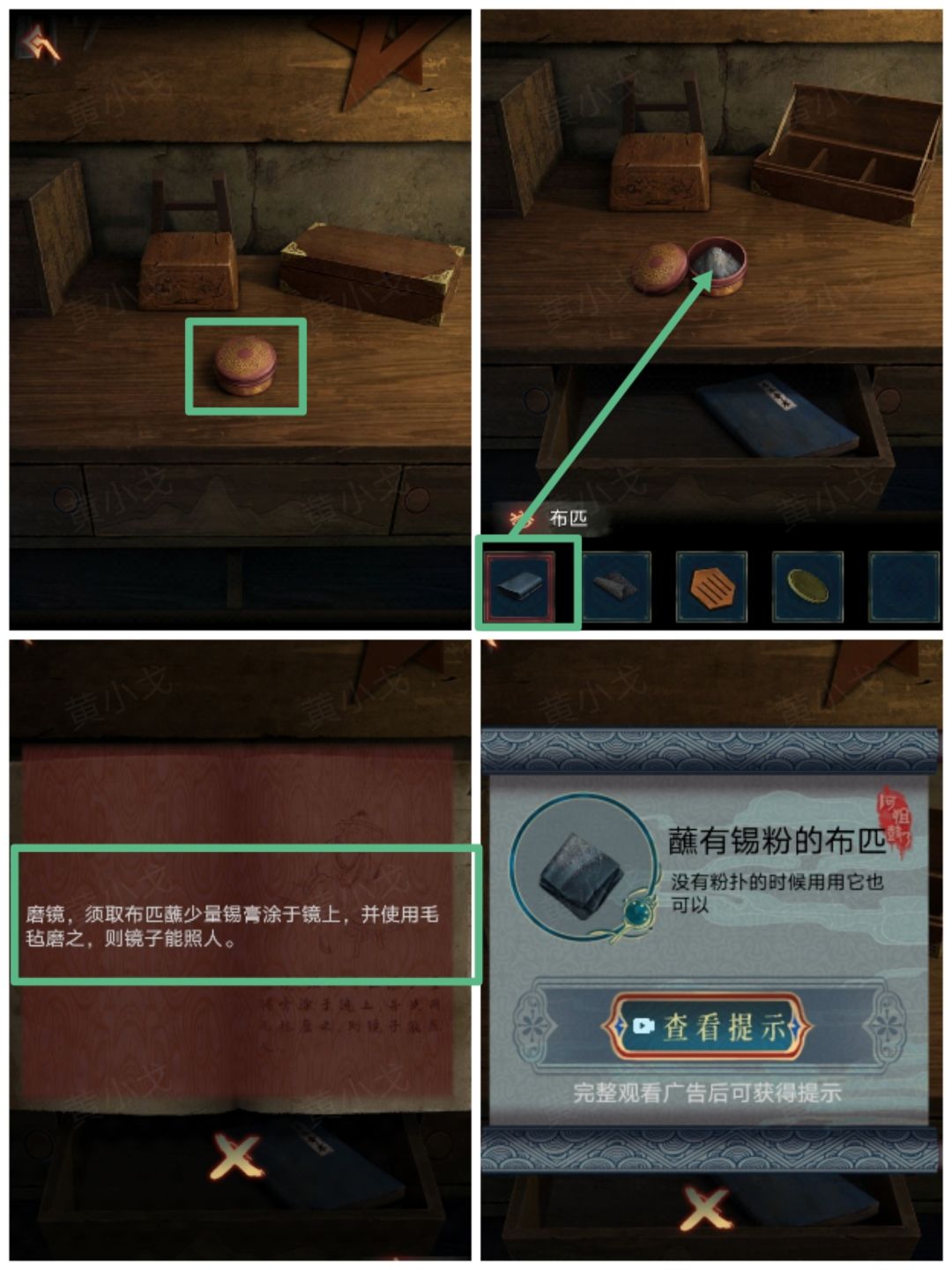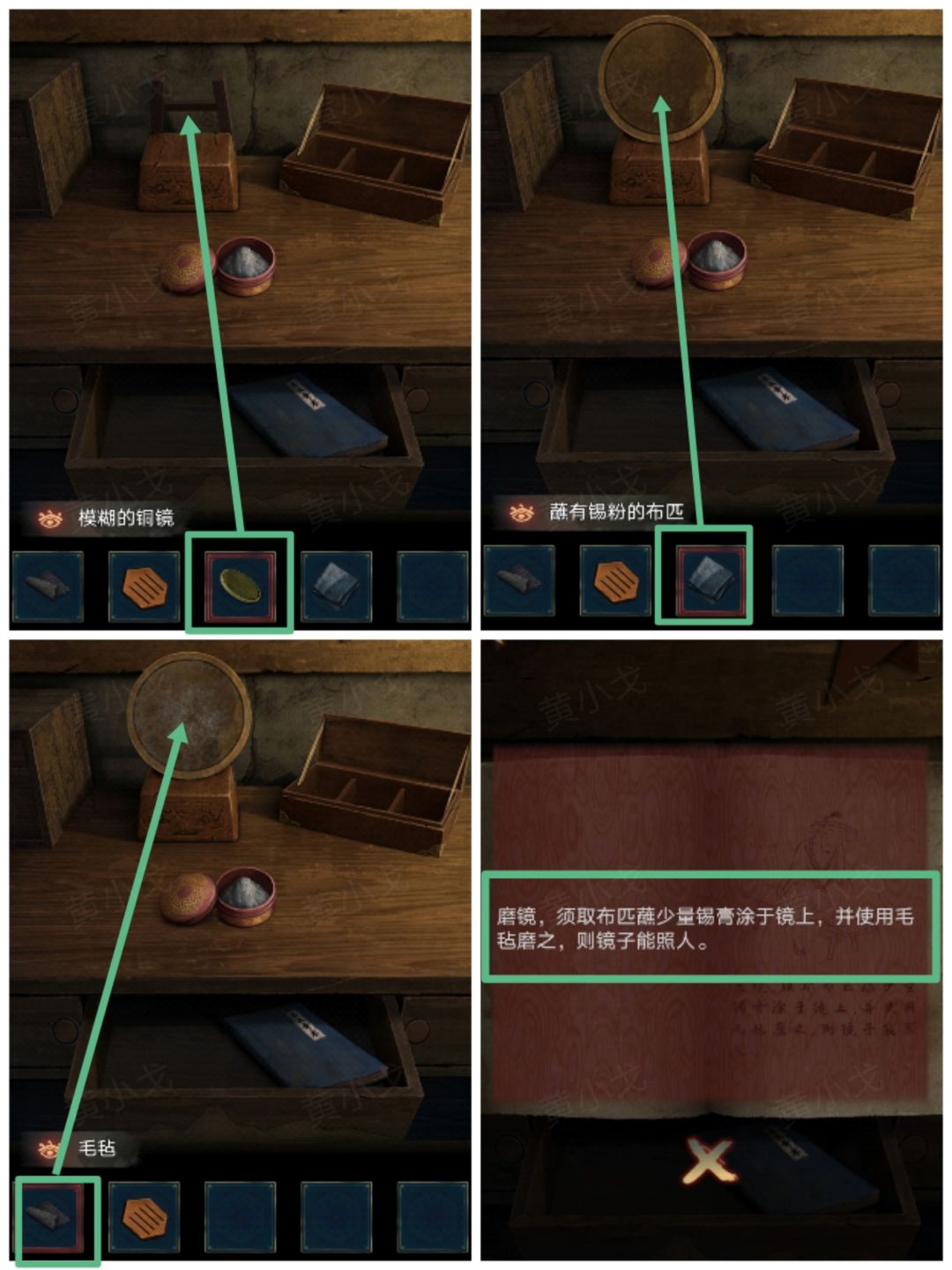 12.把【模糊的铜镜】放到架子上,根据书上的线索,把【蘸有锡粉的布匹】涂在镜子上,再用【毛毡】擦干净