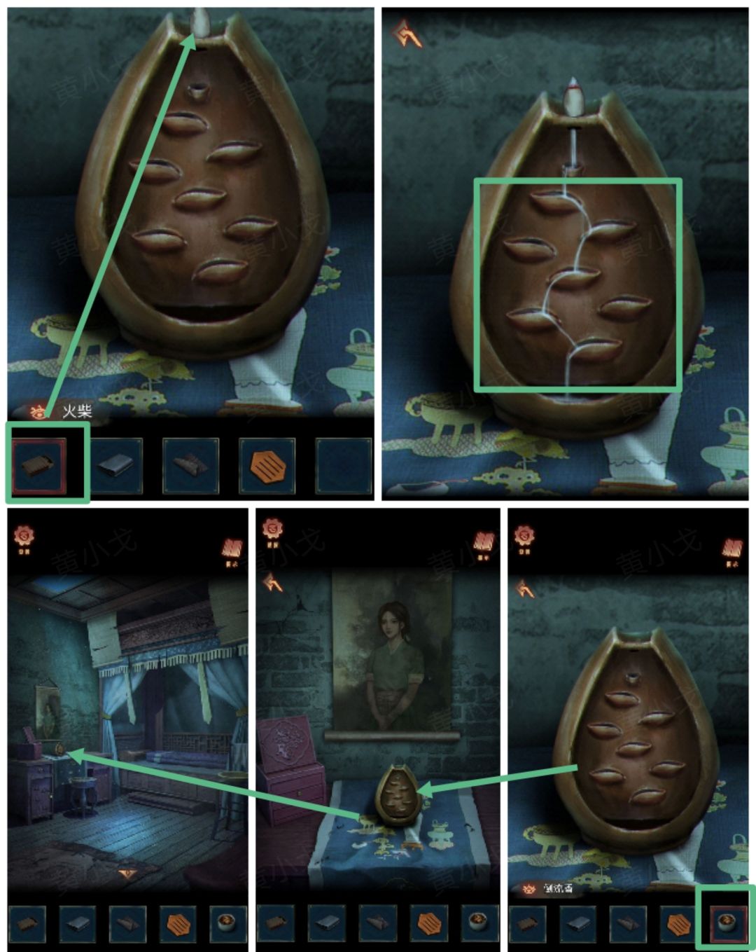 6.(卧室)点击桌子上的香薰,放上【倒流香】,用【火柴】点燃;获得线索