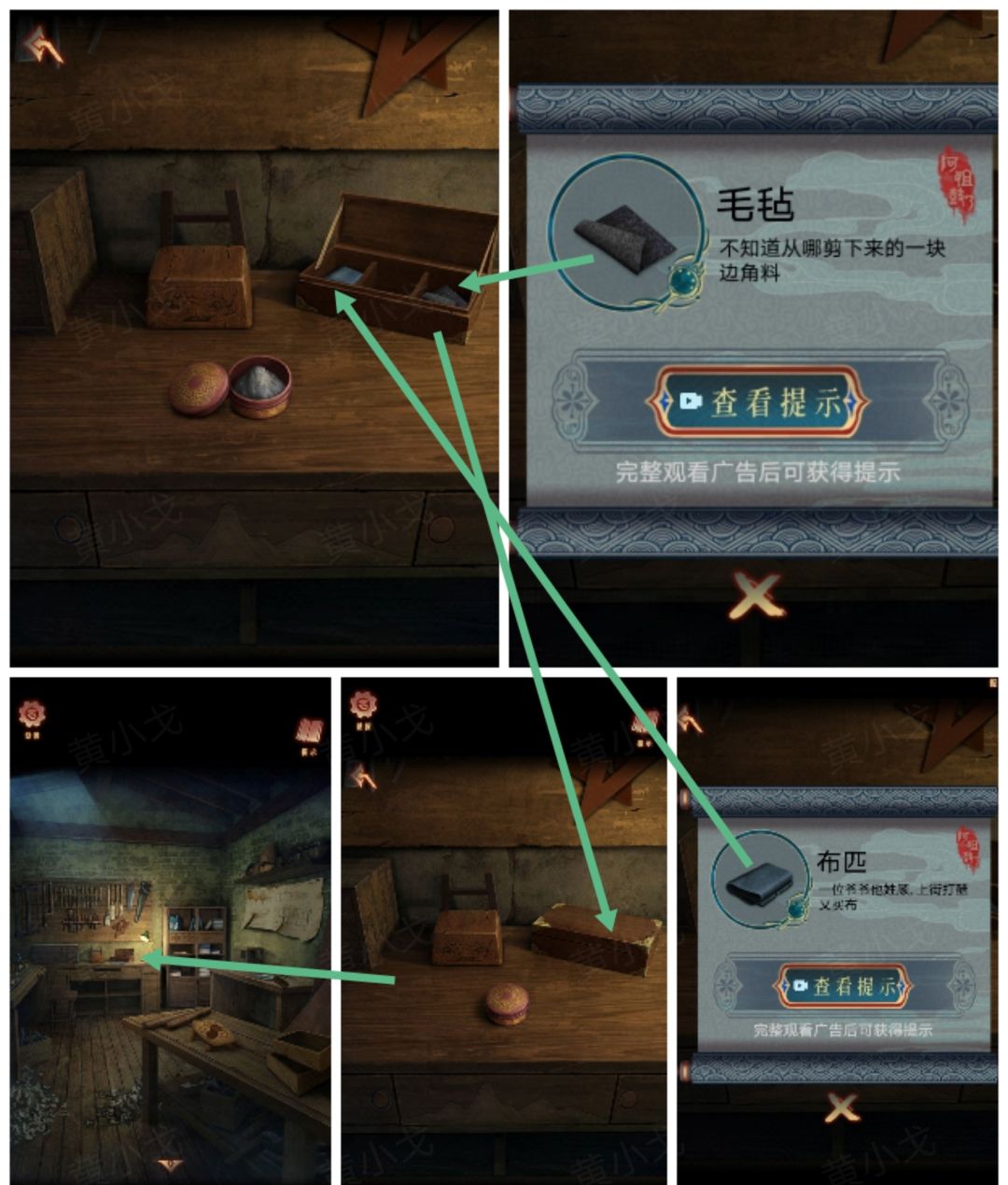 9.(木工房)点击中间的桌子,打开木盒,获得【布匹】和【毛毡】