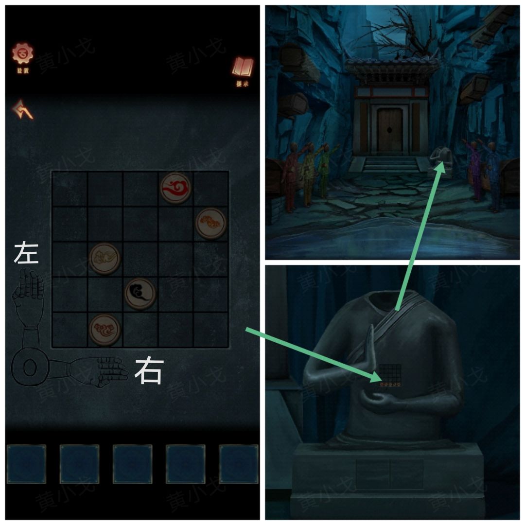 24.点击无头雕像身上的机关,根据人偶上的线索,调整对应图案滑块的位置