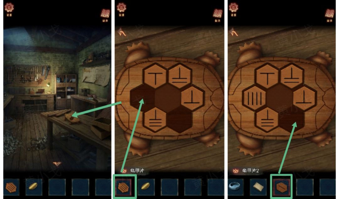 17.(木工房)点击桌子上的木乌龟,放入【龟甲片】和【龟甲片2】