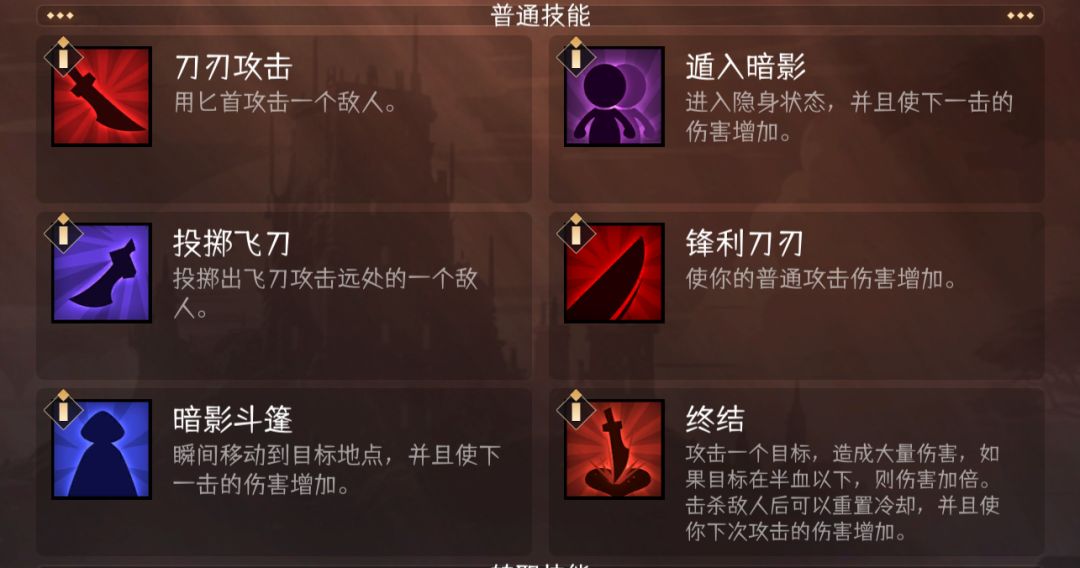 终结:对半血单位有大幅增伤,还有击杀重置冷却和增伤buff,对魔王有不错的攻坚能力,可惜对于暗影刺客来说,转职后的两个输出技能适配性要高太多了。