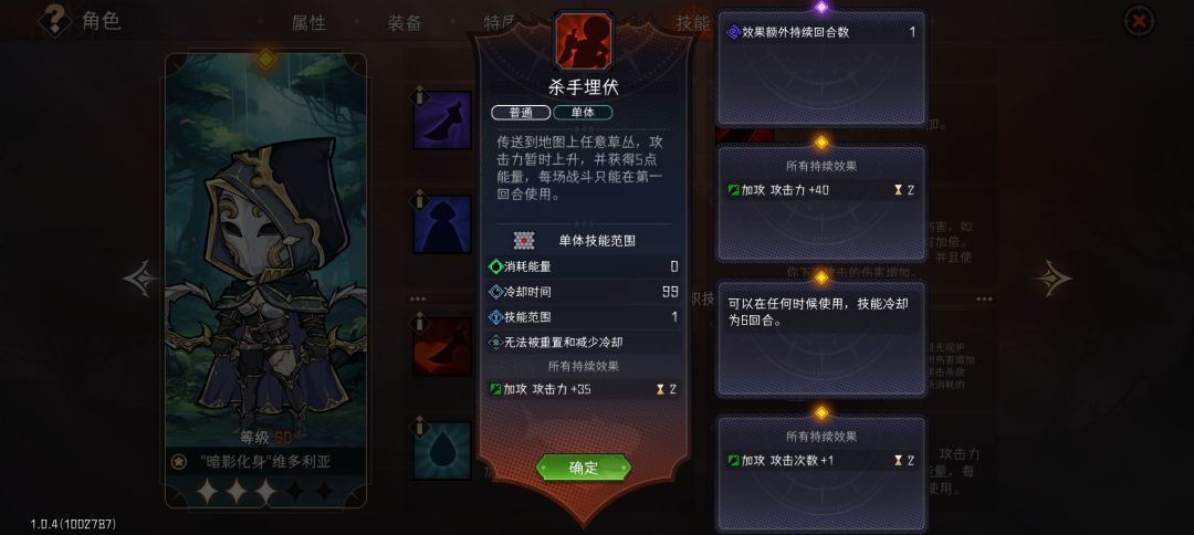 杀手埋伏:瞬移,增加能量和攻击力。神中神,暗影刺客的绝对核心,相比于其他的一次性buff技能,杀手埋伏提供的加成是按回合持续有效的,不过也因此限定了开局使用。用法上依然是等待敌人先行动,然后把原本走过去的操作替换成瞬移,打完一套下回合buff还在,连续两轮的超高爆发。