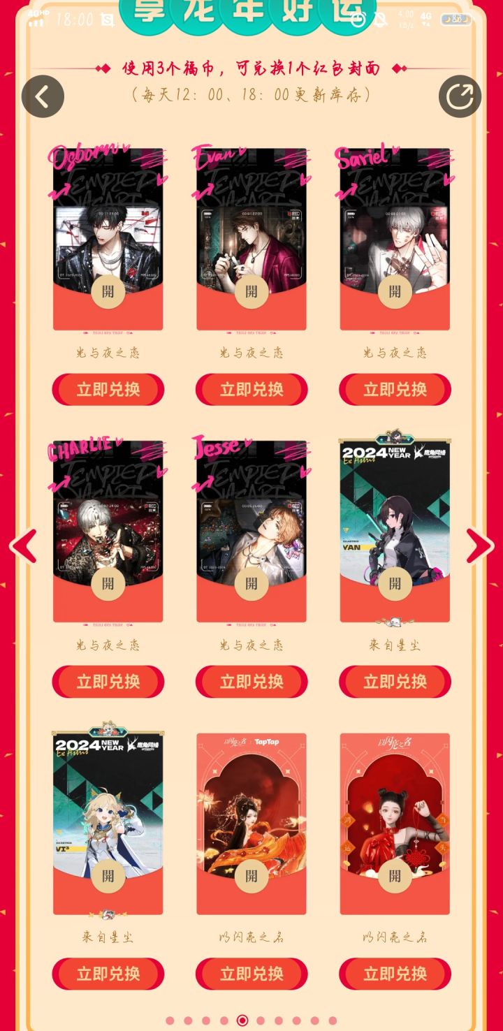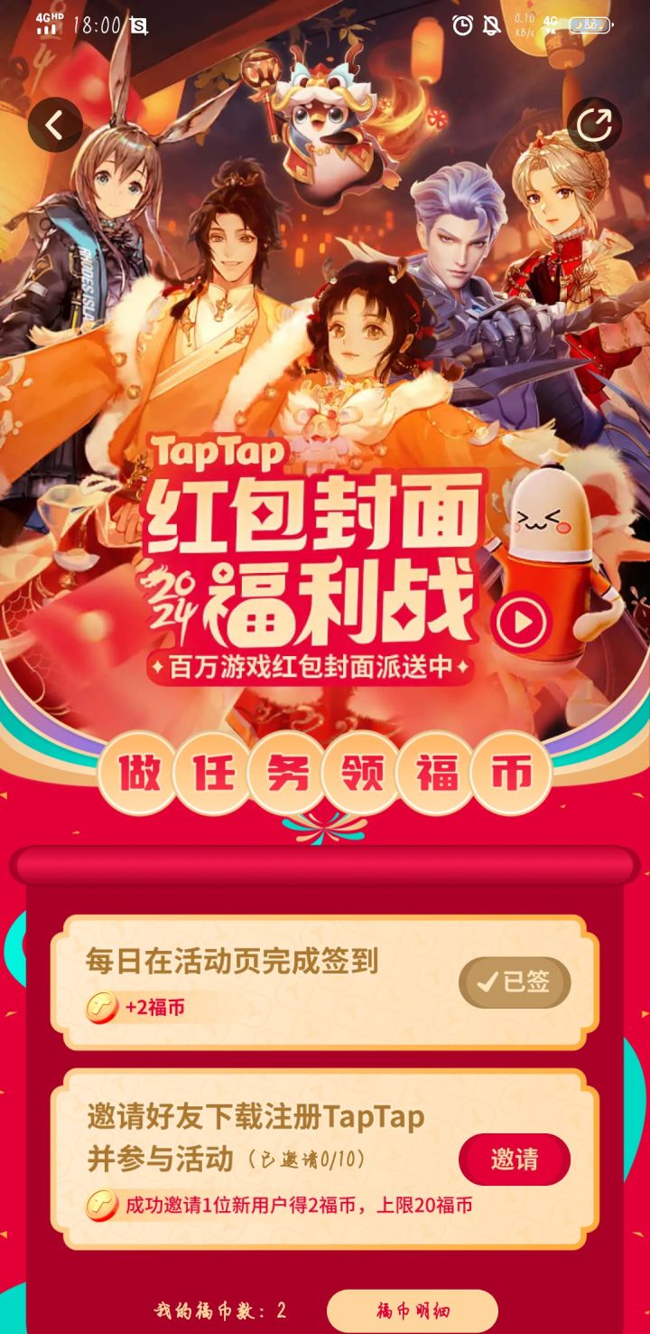 emmmm如题,我今天才发现tap可以换到光夜的红包封面,没抢到封面的可以用这个活动换,不邀请好友一天两个福币,三个可以换一个,不过好像有库存限制,希望明天还有