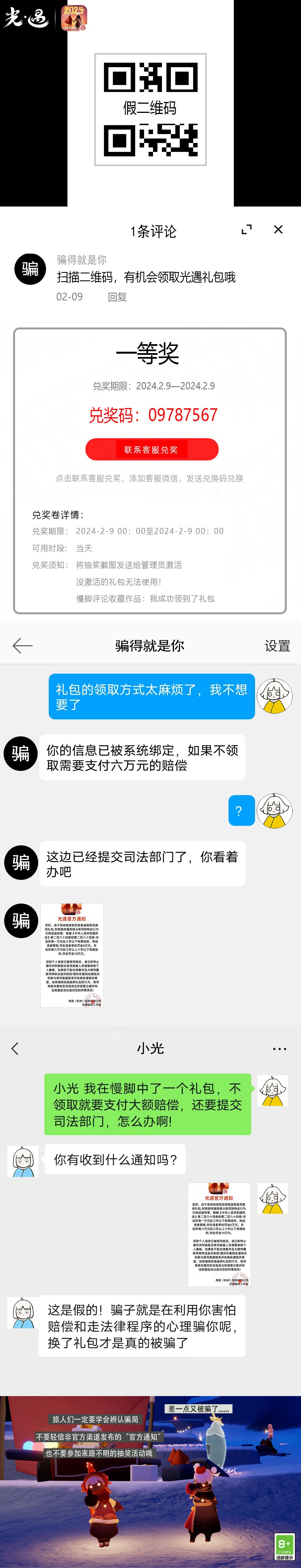 此外,我们针对近期天空王国中出现的 礼包诈骗 的现象准备了一期防骗分享,希望旅人们甄别诈骗行为,避免造成自身损失。