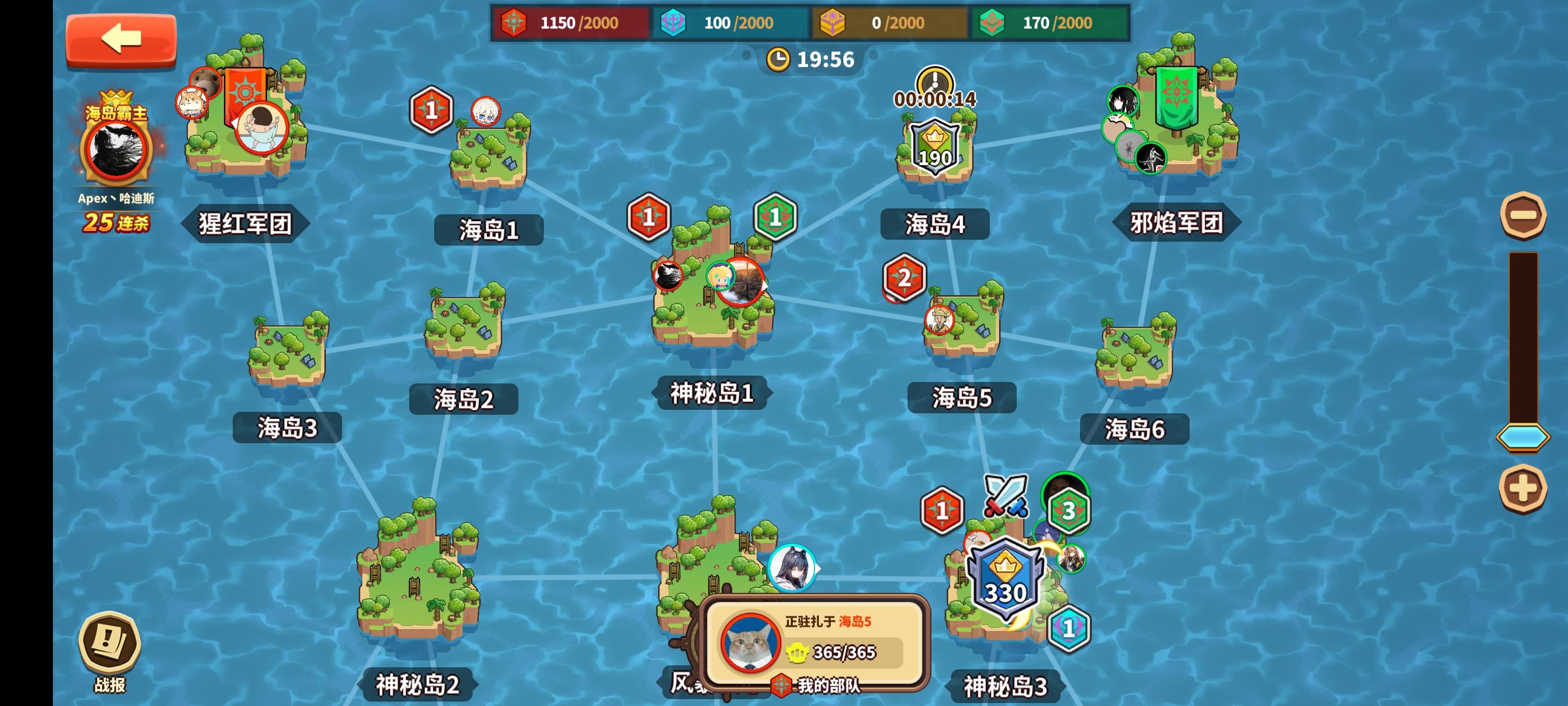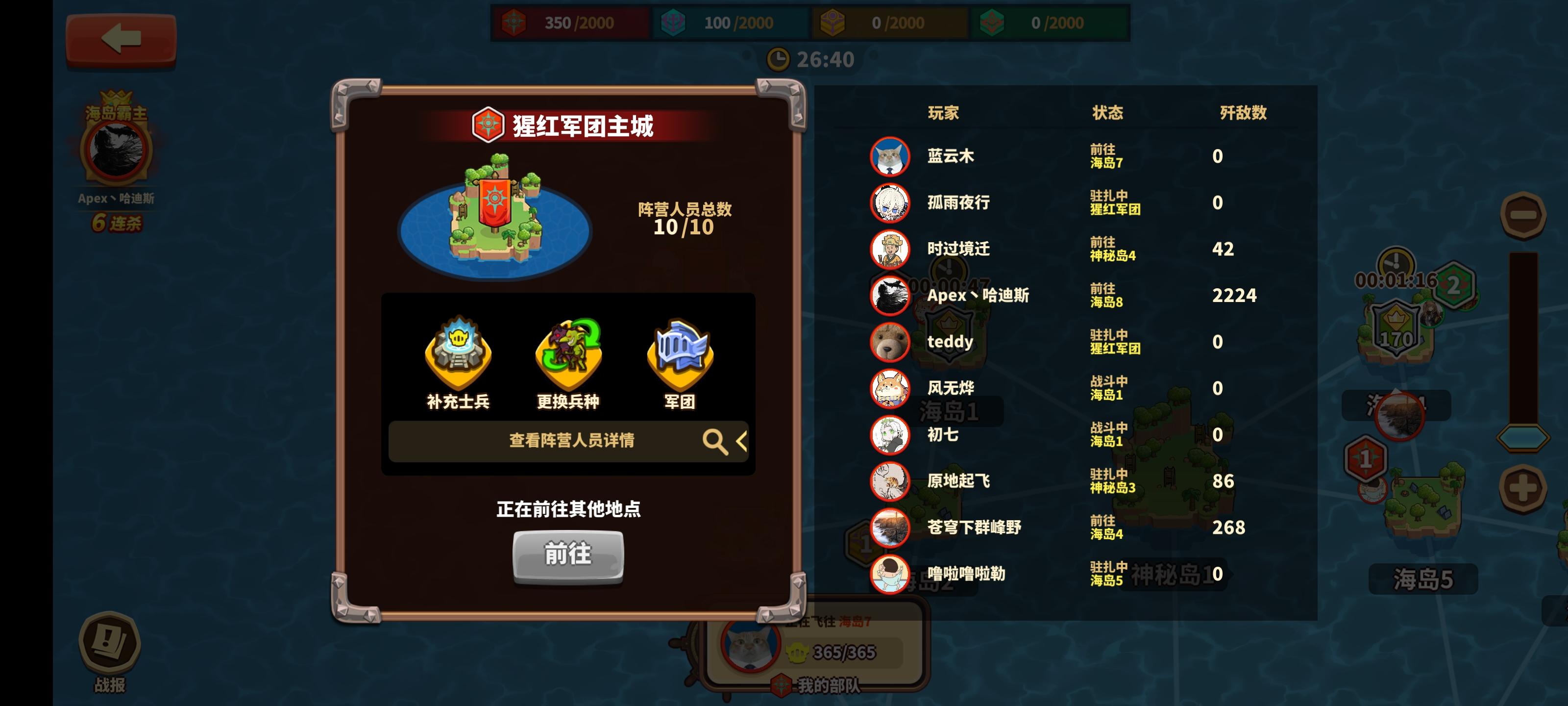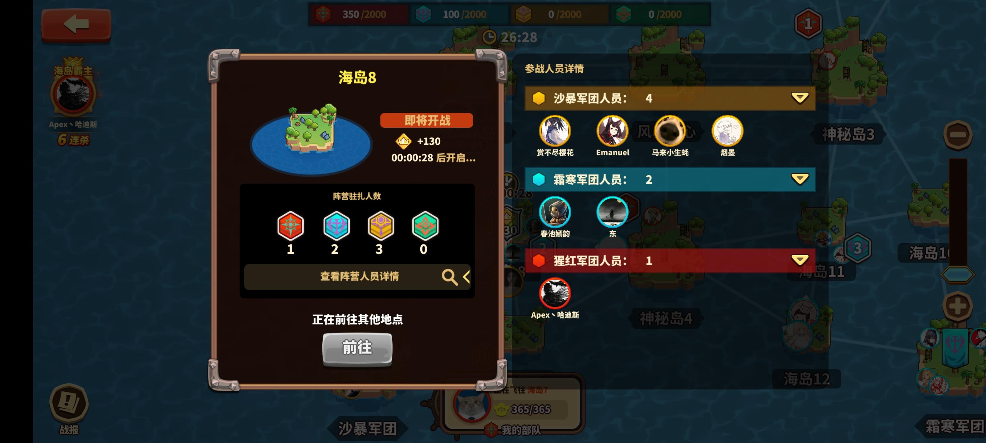 接下来观察大佬的动向,放大地图可以看到头像动向,点击某个海岛可以查看该海岛目前的人员,当他进入某个积分海岛时,我们就去旁边的海岛等待,当该积分海岛其他军团人数减少到1或2,且没有其他人进入或在路上时,即可进入该积分海岛混侵占数(注意已经在侵占状态的人在有敌方刚进入的时候不会被打断,而是由刚进入的队友和敌方进行战斗):