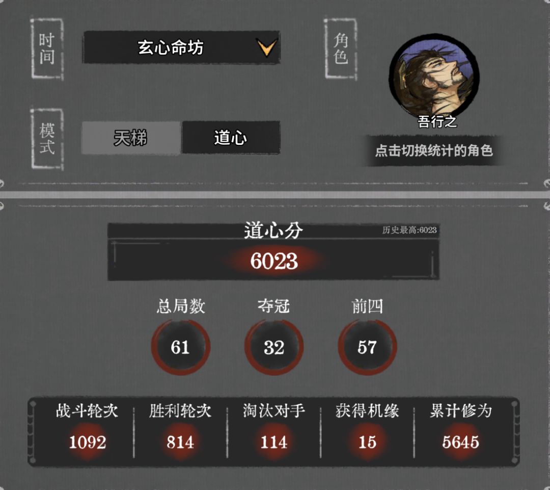 最新战绩为:吾行之道心模式总局数61场,第一32场,前四57场。