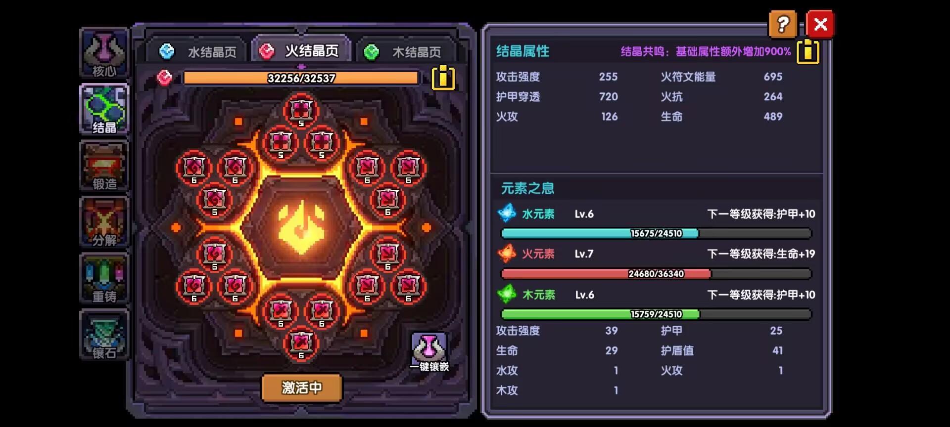 右上角可以看到目前符文结晶提供695火符文能量