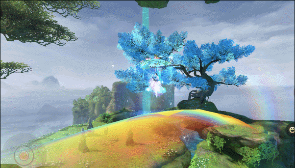 断桥,虹桥连接的三块断崖组成了整个凝碧崖,每块断崖在保持着特色的同时又因为植被等元素的统一显得无比和谐,用秋水共长天一色形容这片区域再合适不过。巨大的藤蔓伴随肆意生长的荷叶围绕在蓝色花瓣的巨大古树下,远处云海与仿若天上来的瀑布相映成趣,一幅巨大的画卷正在你的面前展开。