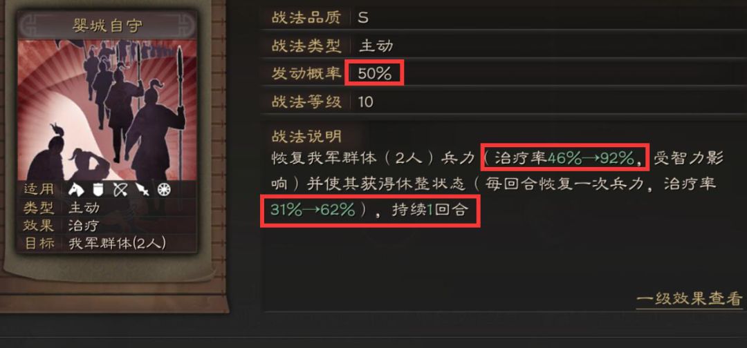 该战法有50%概率发动,发动后恢复我方二人46%-92%(满级)兵力(受到智力影响),并且获得1回合休整状态,行动时可以恢复31%-62%(满级)治疗率的兵力。战法是二段治疗类型,在拥有休整状态时获得第二段治疗。