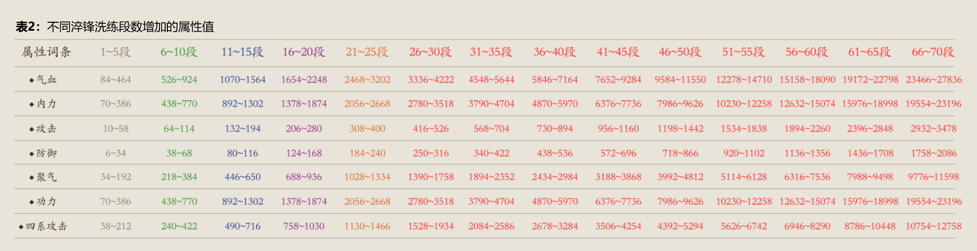 淬锋能够提升角色的7项基础属性(气血、内力、攻击、防御、聚气、功力、四系攻击),但各项基础属性对于角色总战力的影响程度并不相同,而同一淬锋洗练段数所增加的各项属性值也不相同,这就导致选择不同的淬锋属性,角色的总战力也会不同。