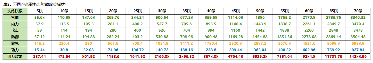 由于表3所列数据是1条属性词条的增加量,而同一部位装备可以洗练3条属性词条,另外淬锋精通还能提供额外的百分比加成,所以选择不同的淬锋属性对于总战力的影响还是比较可观的,尤其是当出现排名临界几人的总战力比较相近时,可以试试通过改变淬锋属性完成超越(例:假设武器部位洗练段数为35段,淬锋精通加成为50%,则洗练3条四系攻击的总战力会比洗练3条攻击高出9865)。