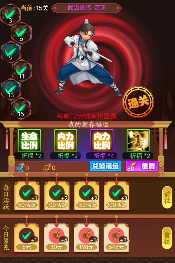 内力没达标的不想充钱的嫖11就放弃15吧,达标的打过13后挂机一晚上运气好一般就过了(运气不好那就是命)。