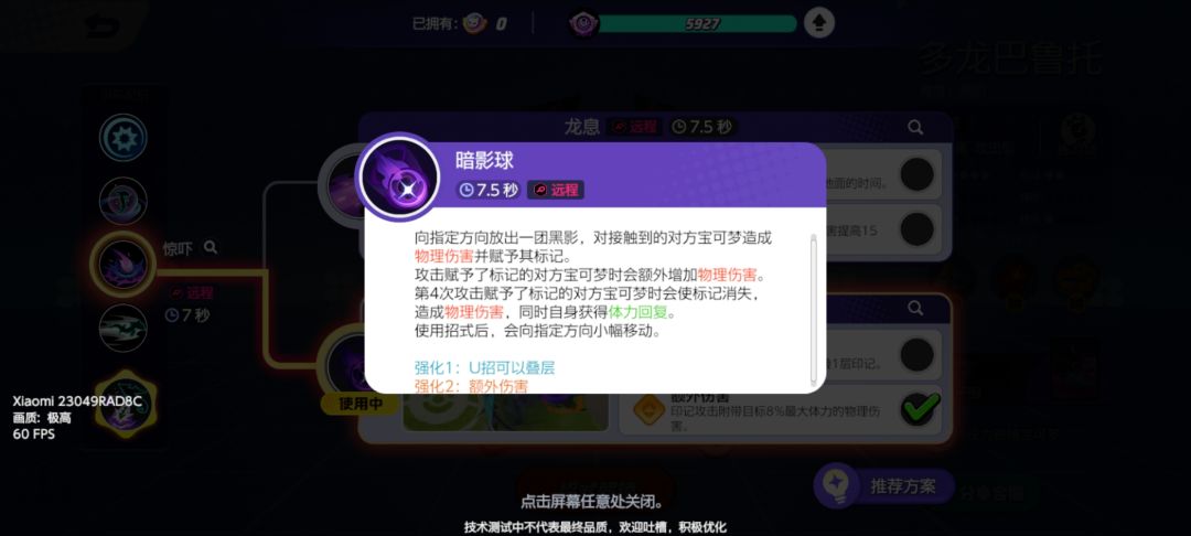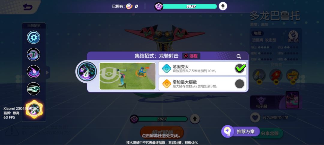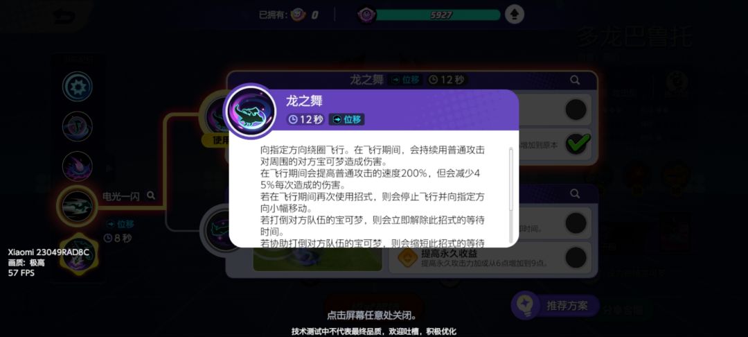 二技能推荐龙之舞,释放龙之舞技能后需要移动键左右来选择逆时针或顺时针转动,在转动时会释放普攻来对一定距离的宝可梦造成伤害(小心被控,被控的话技能会被打断,且龙之舞进行时还是会受到伤害)!释放时无视障碍物,移速增加,可自动转一圈结束也可手动选合适位置结束,且结束时也会有一段位移。龙之舞造成伤害后,如果击败对方,会直接刷新CD,如果是助攻,会缩短CD!强化二可以提升龙之舞释放时普攻所造成伤害!