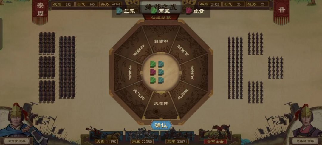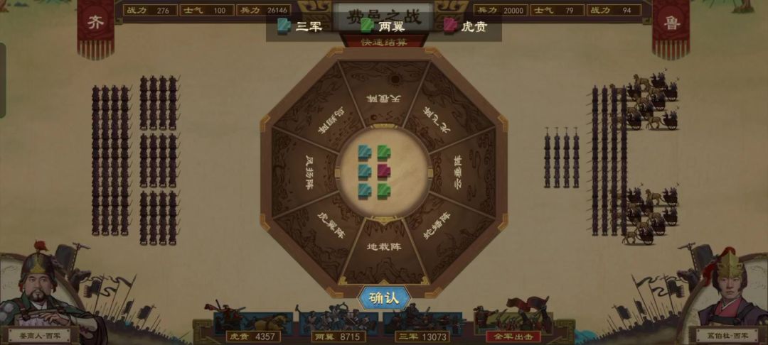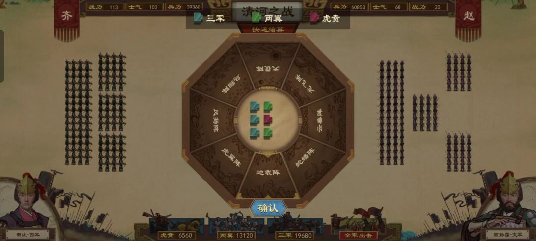 最后,当碰上敌方将弓弩手配置在后队的(特别是前车后弓),采取两侧迂回包抄可以有效对付这类阵型。具体做法是用初始的地载阵,像下图一样将前后军分别移往右上和右下方位置,待有部分骑兵突入到该位置后,就点击"全军出击",将后面的弓弩手包围,如果比较顺利的话,可以形成包圆的效果,将后面的弓弩手率先消灭。