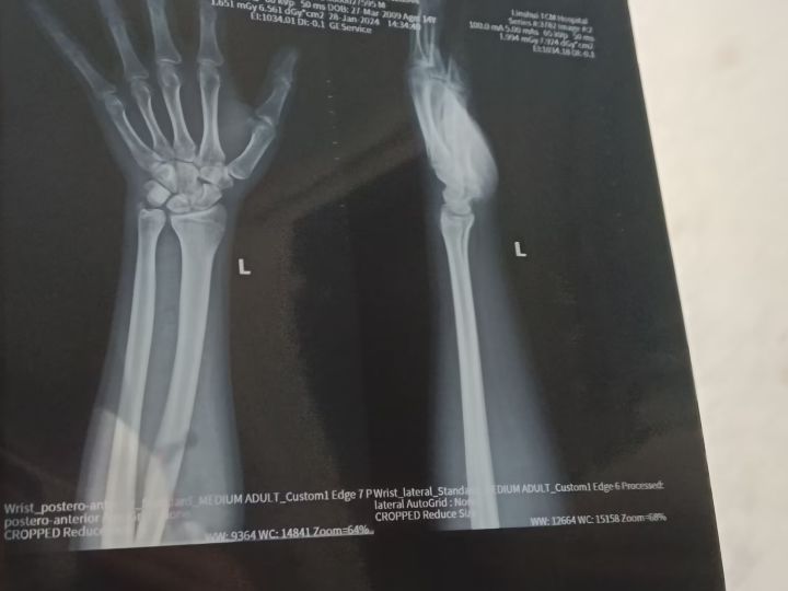 最近手旋转提东西的时候有点痛,然后去医院检查了一下,照了片,结果是先天性尺骨撞击,这个就是骨头长的太长了,影响到其他骨头的运动和移动,医生说这个没有办法,只有看以后这个尺骨会不会再继续长