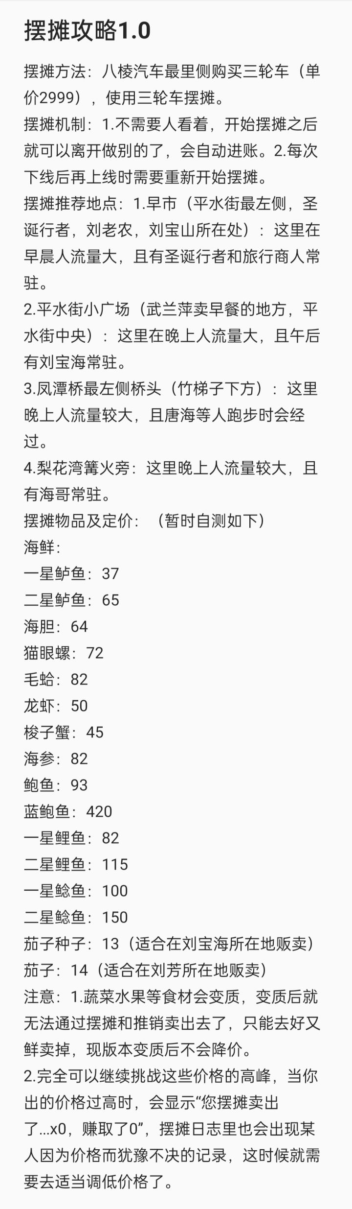 简略地做了一个摆摊攻略,虽然现版本被削过了,但也不失为一个赚外快的好方法,有闲钱的可以尝试一下。