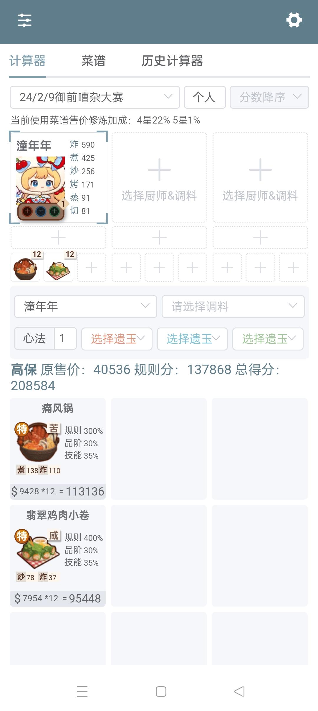 适合不差菜谱和厨子的小伙伴。有修炼。有些没用厨具,或者几乎都是金币池厨具。菜专精几乎都没做。